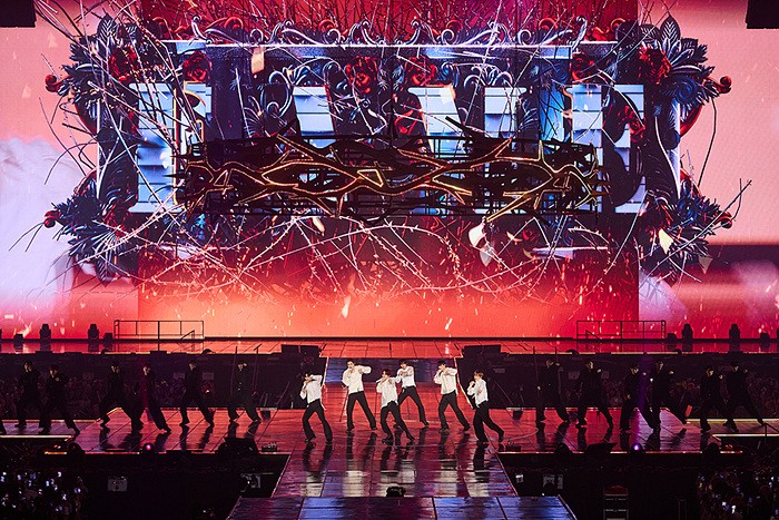 연출도 다채로웠다. '섬씽 인 더 워터'에선 샤막 프로젝션을 활용, 멤버들이 물 속에 잠긴 것처럼 신비롭게 연출했다. '페임'은 턴테이블 위에 불타는 가시 왕관 세트를 조합해 웅장한 풍경을 만들어냈다.