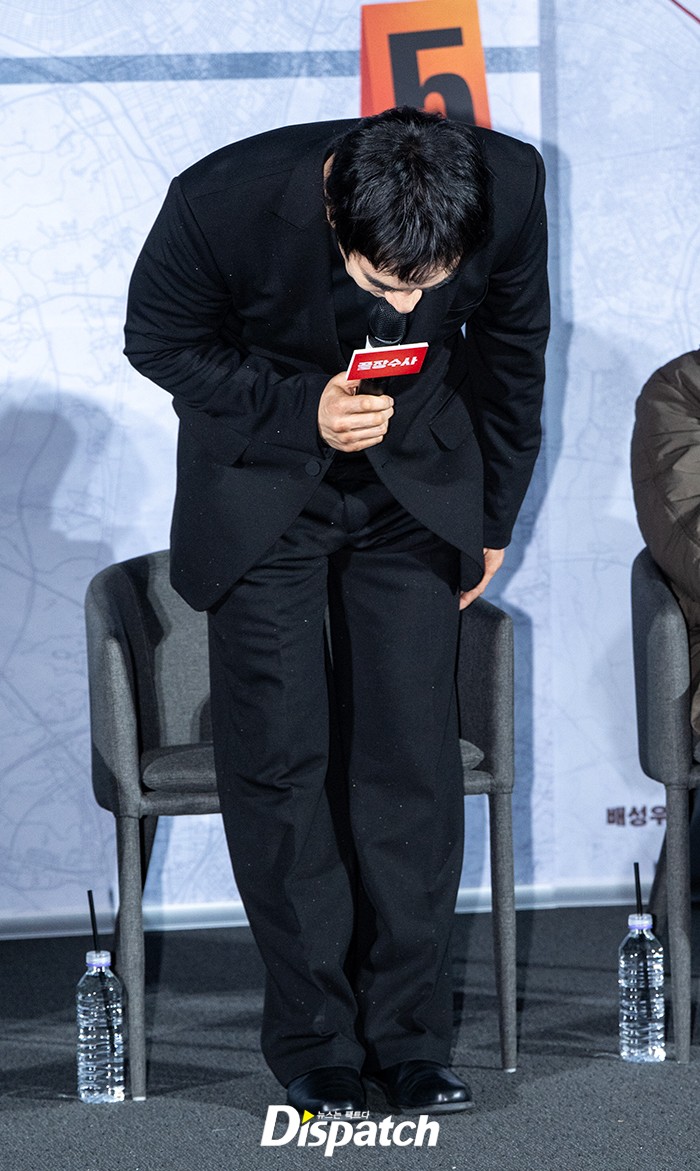 배성우는 차분한 블랙 수트를 입고 참석했다. 물의를 일으켰던 부분에 대한 사과를 먼저 하고 기자회견을 시작했다.