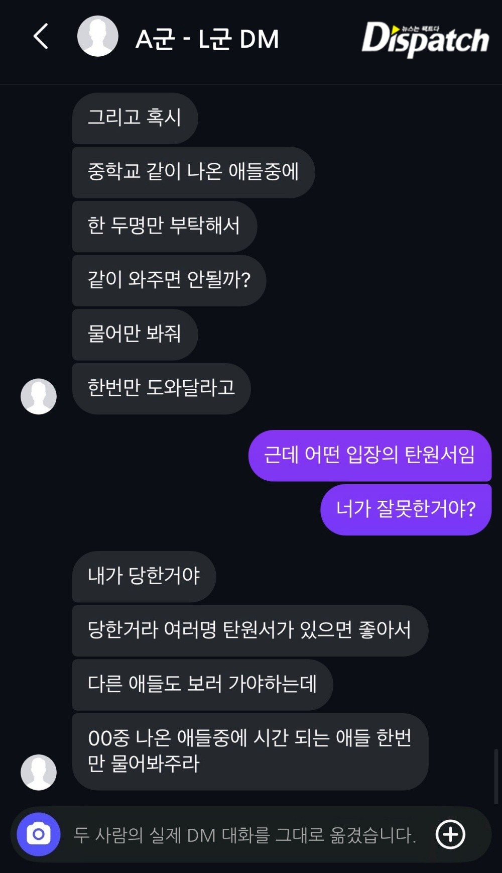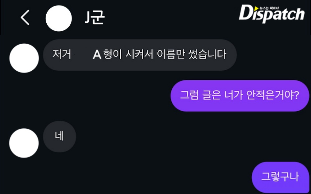'디스패치'는 H군과 K군이 나눈 DM 대화를 입수했다. 결론부터 말하면, 조작에 가까웠다.