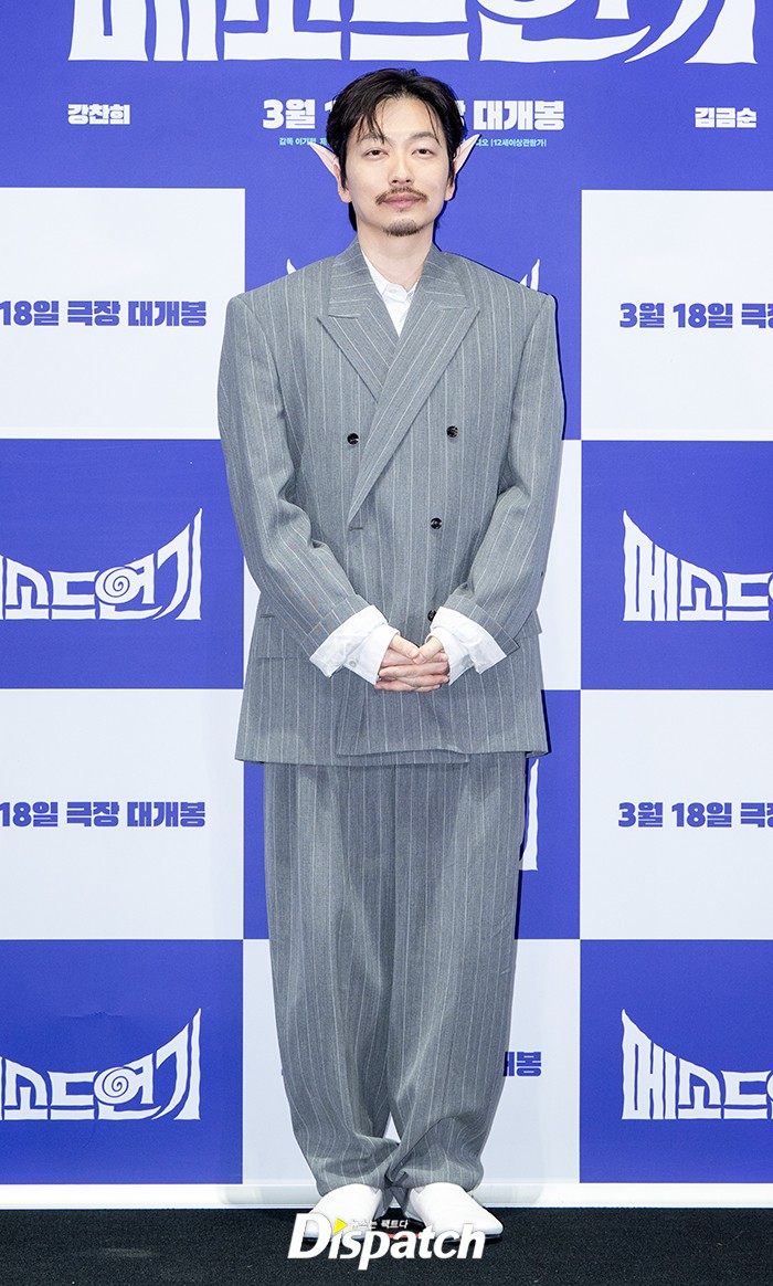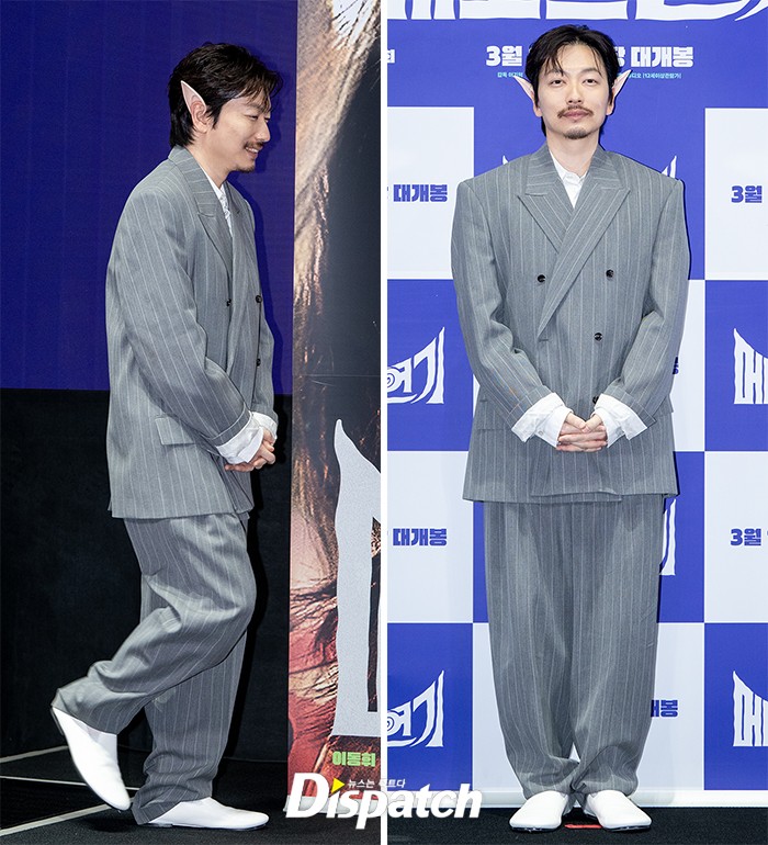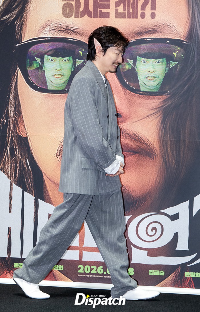 이동휘는 그레이 스트라이프 수트와 화이트 구두로 스타일을 완성했다. 외계인 귀를 쓰고 나와 재치있는 모습도 보여줬다.