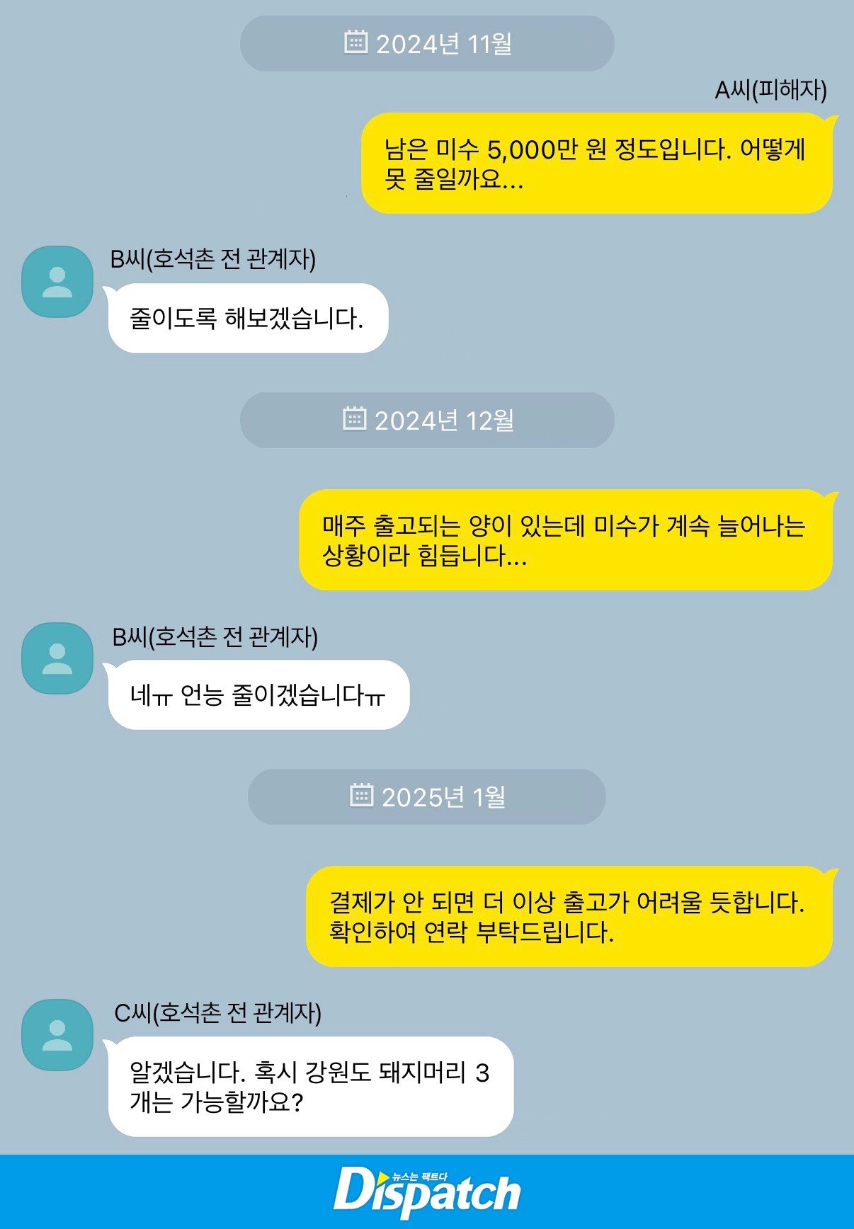 천안에서 축산물 유통업체를 운영하는 A씨는 '디스패치'에 "연예인이라서 믿고 기다렸다. 그런데 1년 넘게 (돈을) 미루고 있다"고 하소연했다.
