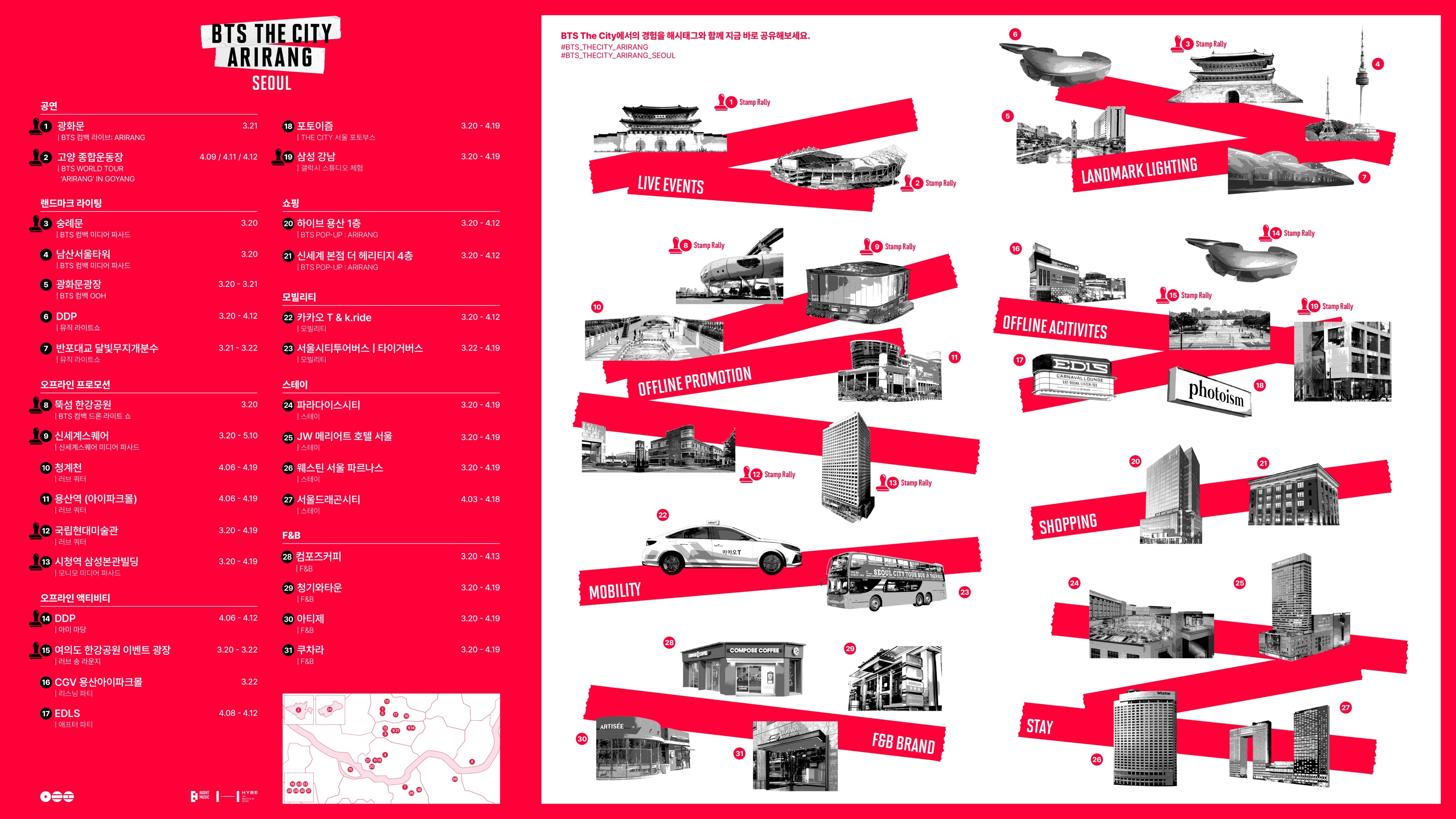 메인 축제는 신보 '아리랑' 발매일(3월 20일)에 맞춰 본격적으로 시작한다. 서울을 대표하는 주요 랜드마크 곳곳에 대형 이벤트를 선보인다.