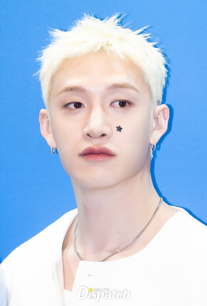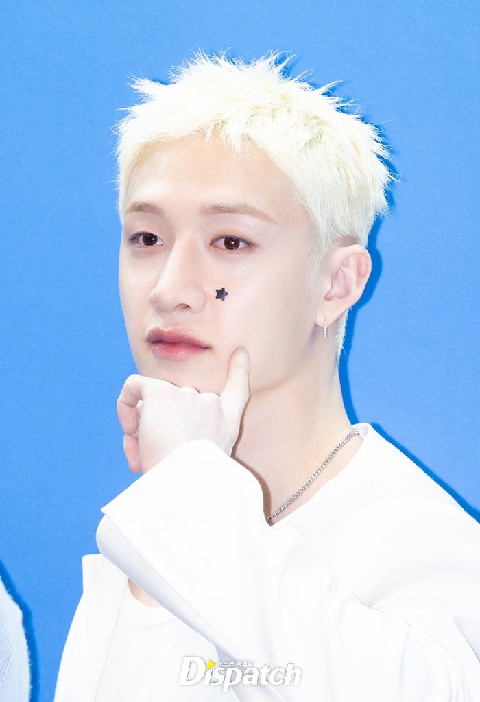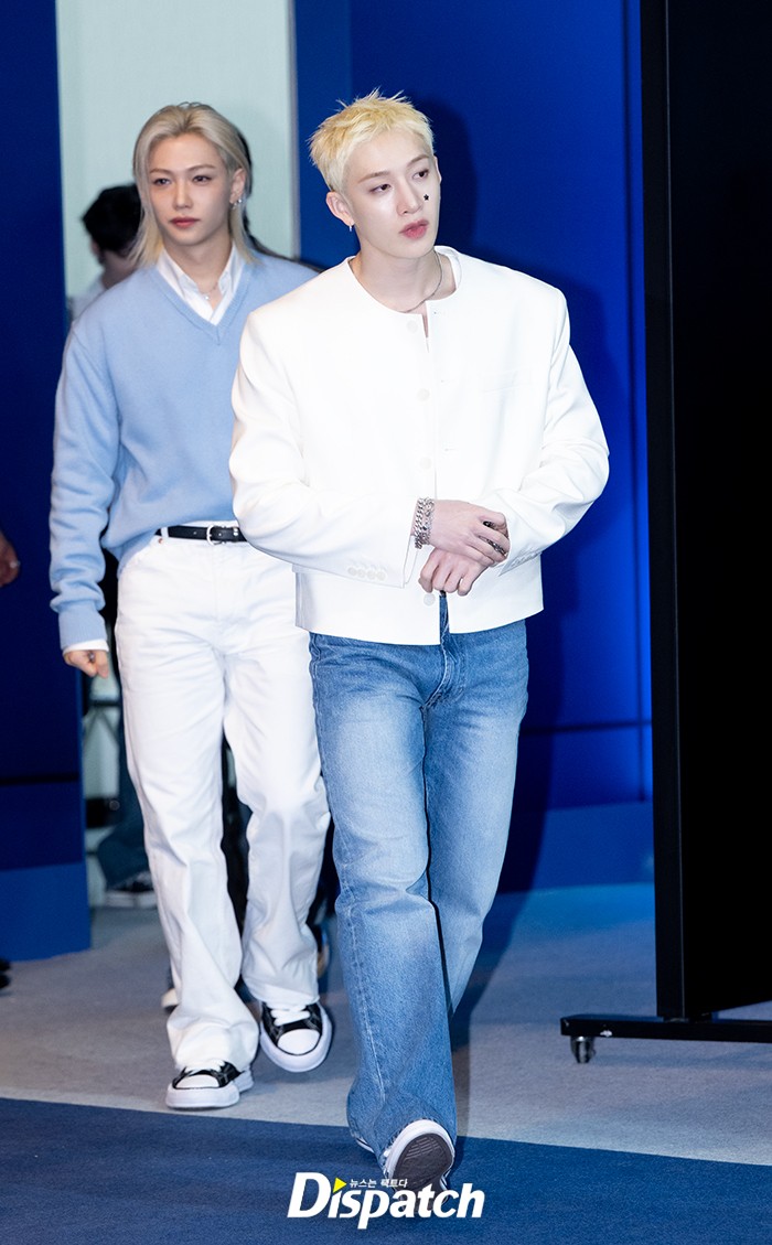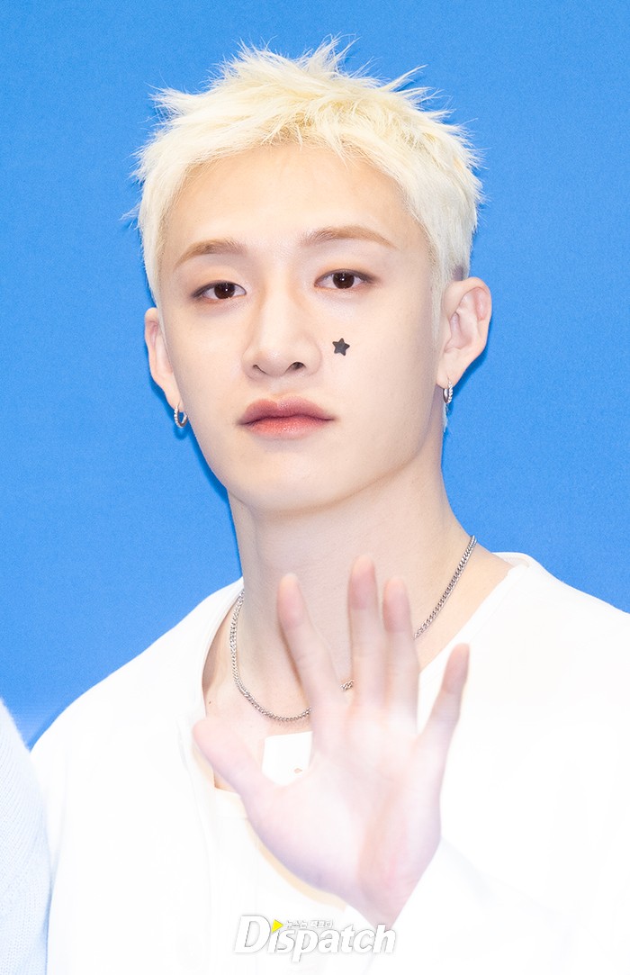방찬은 화이트 자켓과 청바지로 멋을 냈다. 얼굴에 별 스티커로 포인트를 줬다.