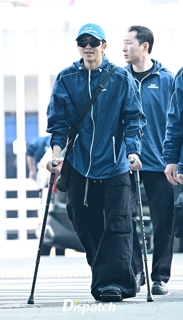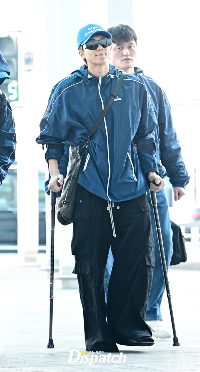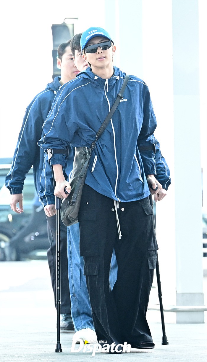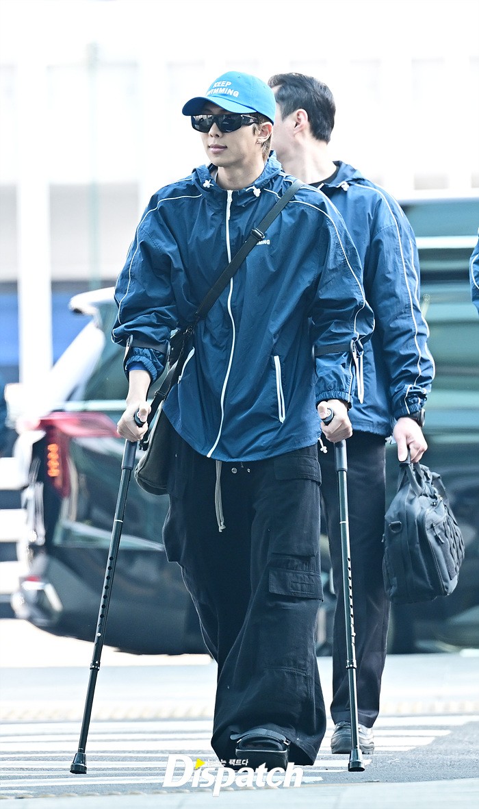 RM은 발목 부상에도 불구하고 밝은 미소로 출국장을 나섰다. 목발을 짚고 팬들에게 손인사도 전했다.