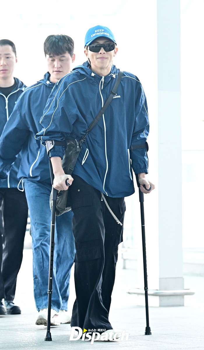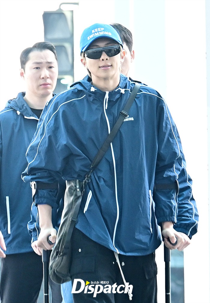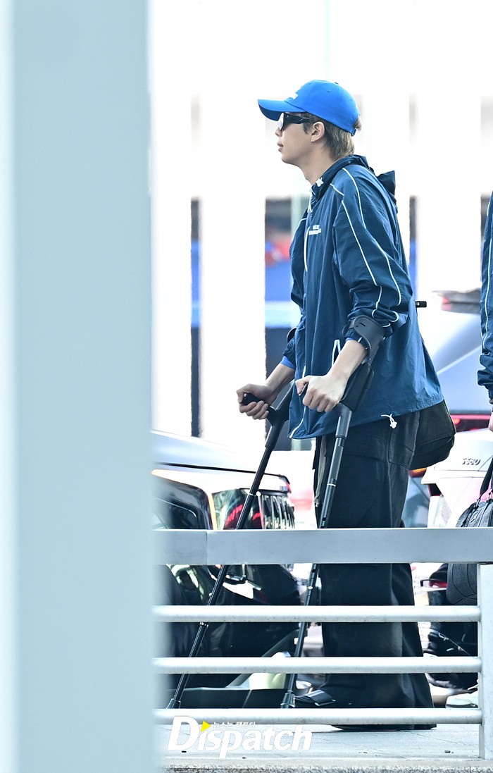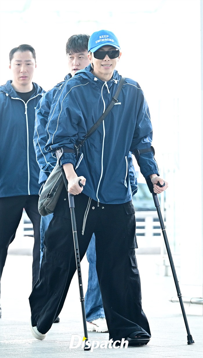 RM은 발목 부상에도 불구하고 밝은 미소로 출국장을 나섰다. 목발을 짚고 팬들에게 손인사도 전했다.