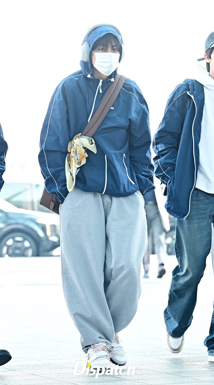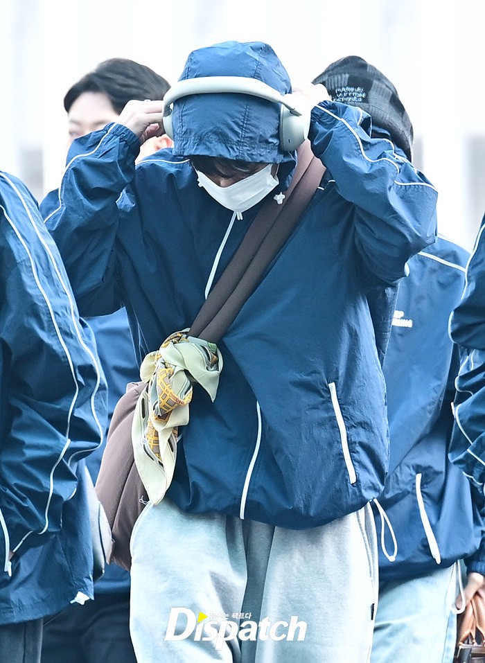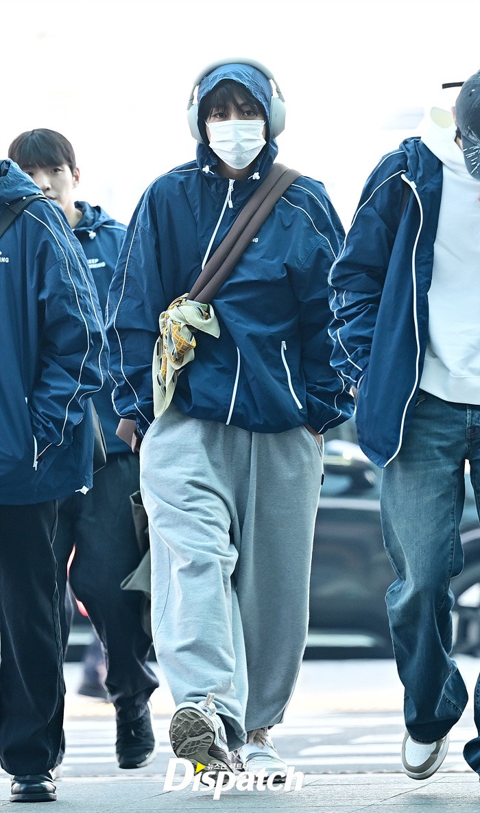 뷔는 마스크에도 강렬한 눈빛으로 카리스마를 뽐냈다. 트레이닝 패션에도 훈훈한 비주얼이 돋보였다.
