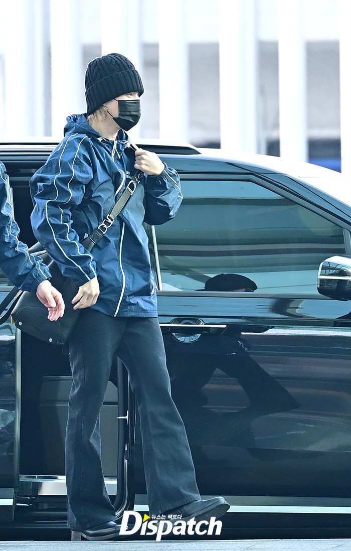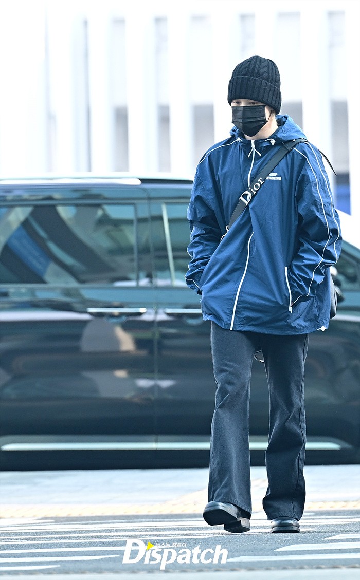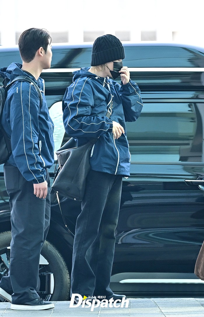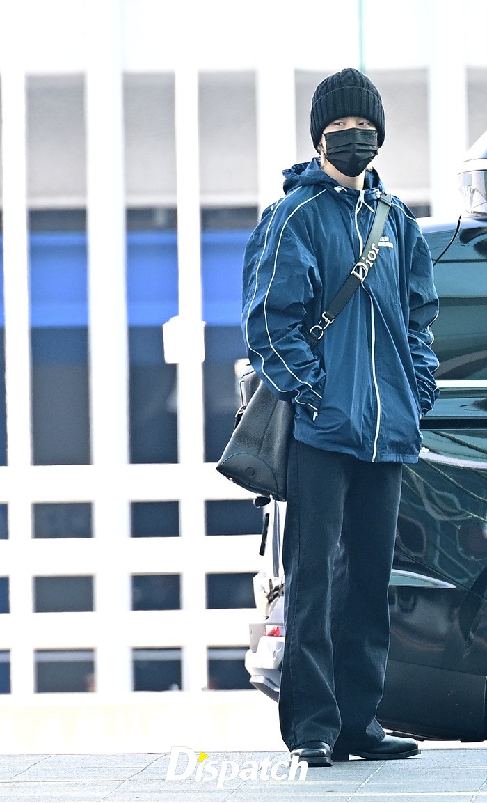 지민은 스윗한 손인사로 공항에 모인 팬들에게 화답했다. 블랙 컬러의 비니와 진, 슈즈로 연출한 시크한 스타일링도 돋보였다.