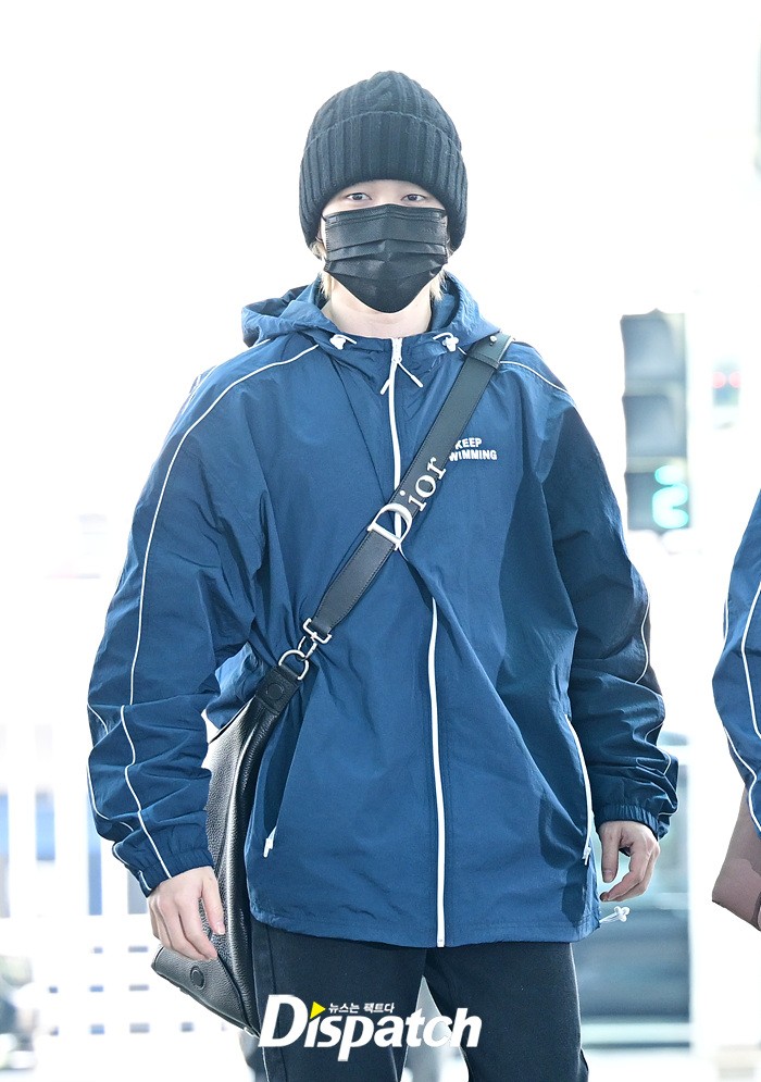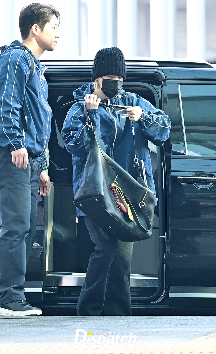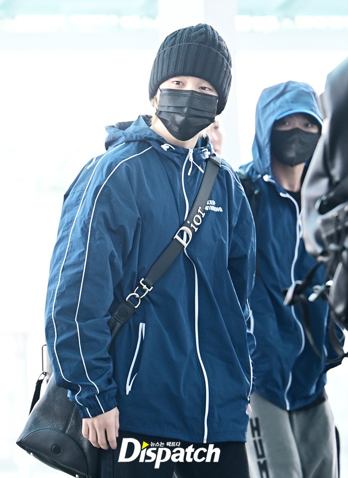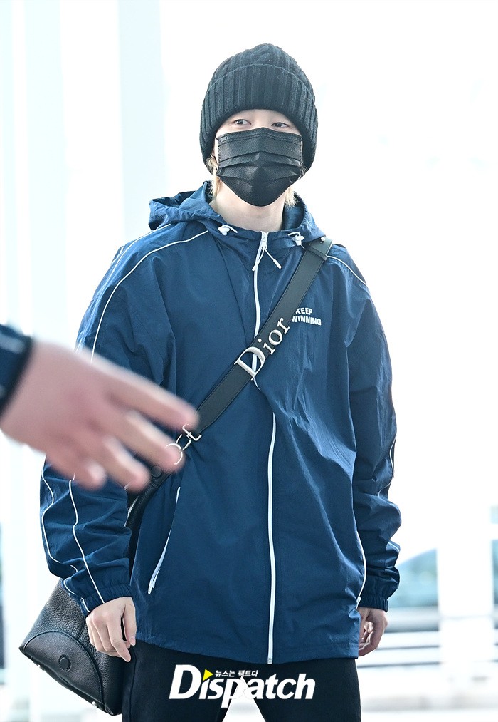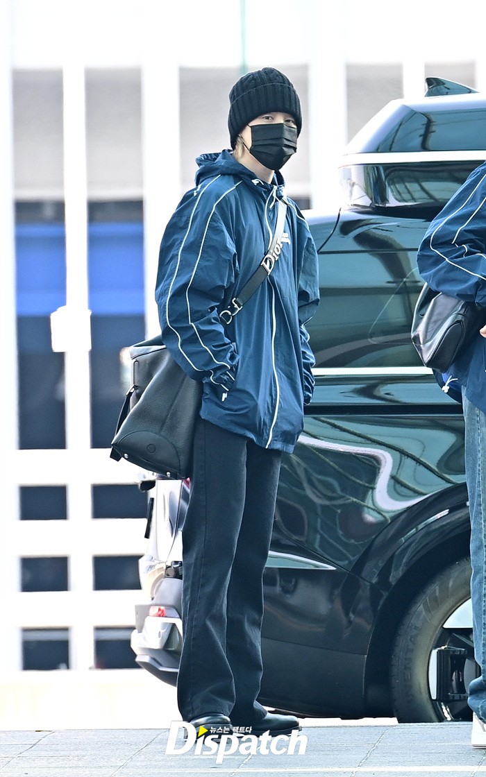 지민은 스윗한 손인사로 공항에 모인 팬들에게 화답했다. 블랙 컬러의 비니와 진, 슈즈로 연출한 시크한 스타일링도 돋보였다.