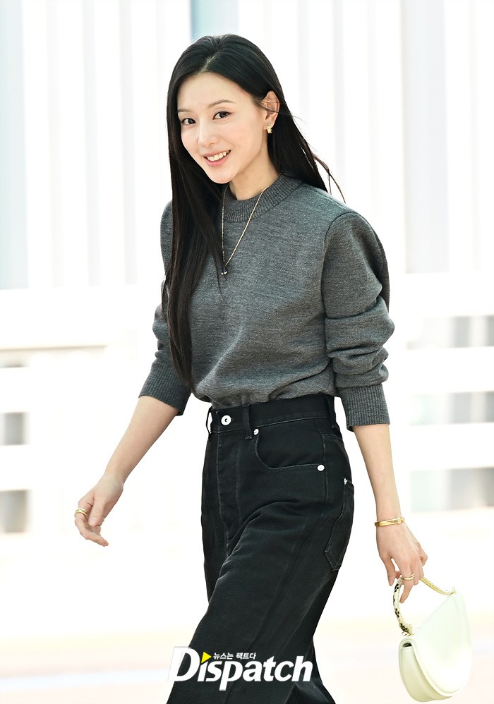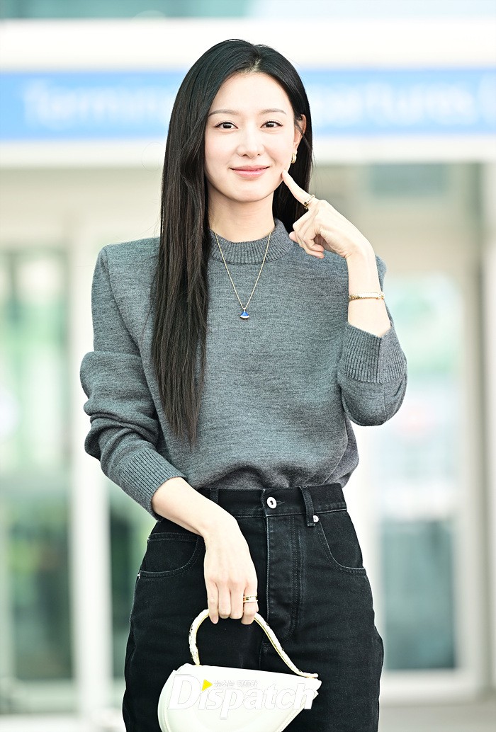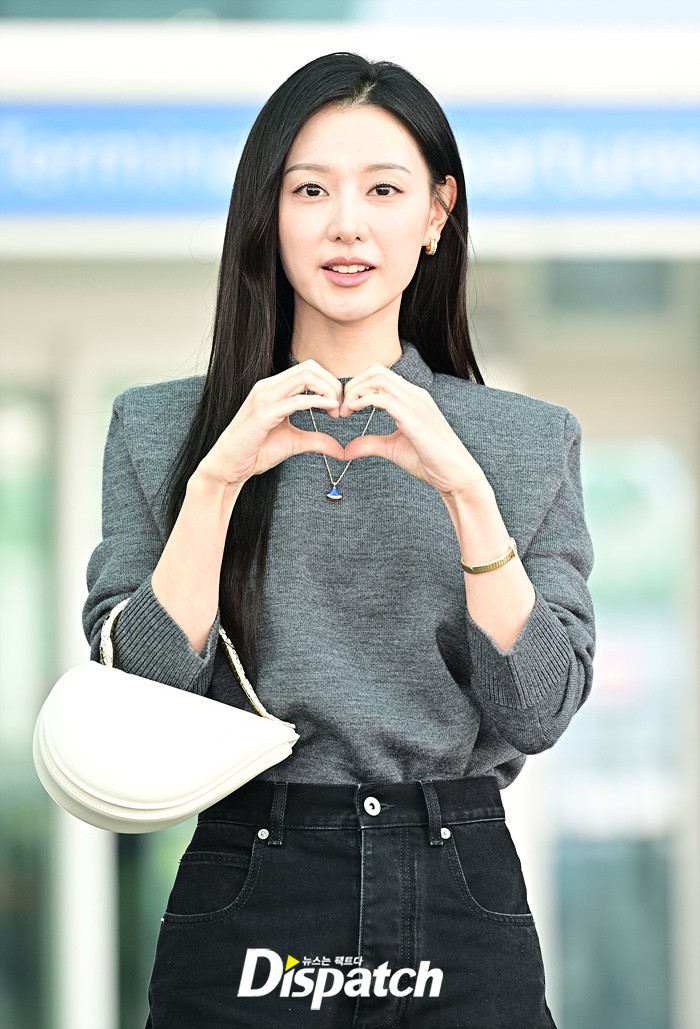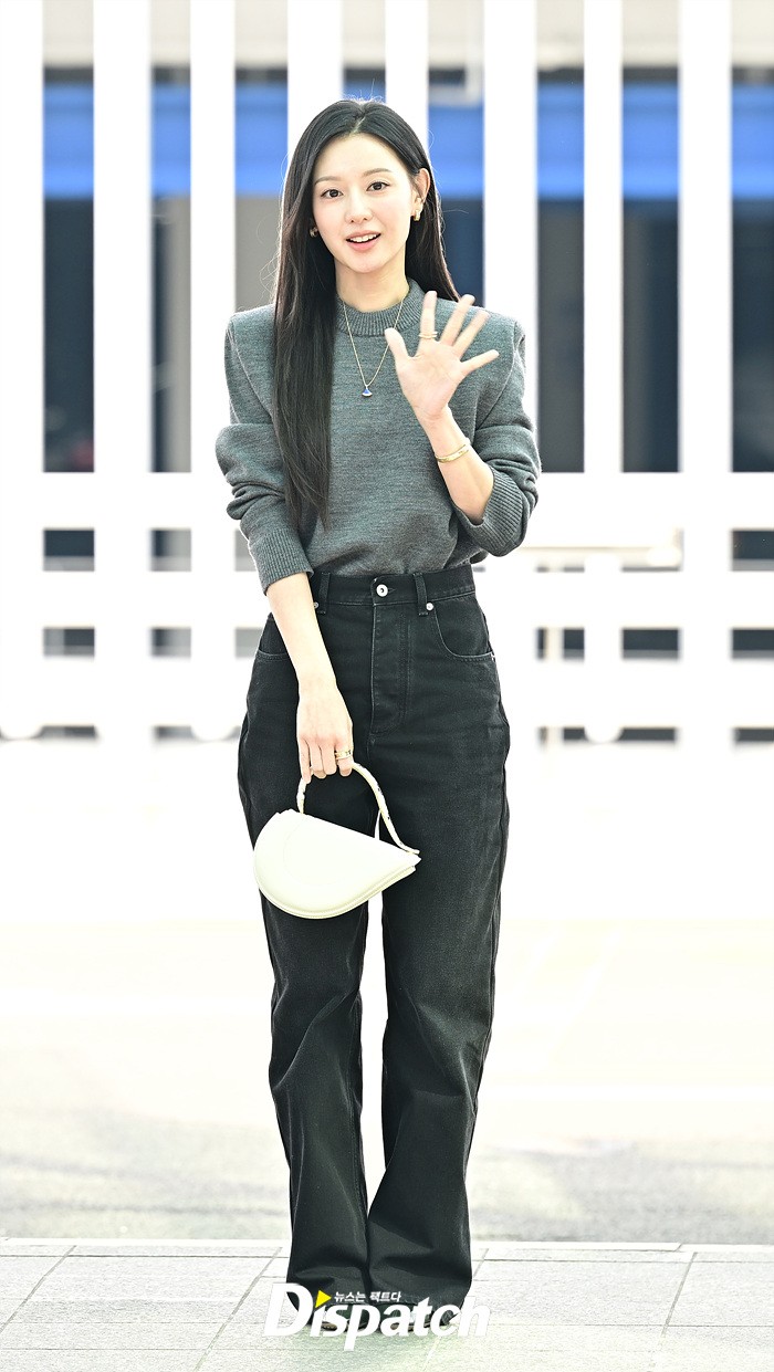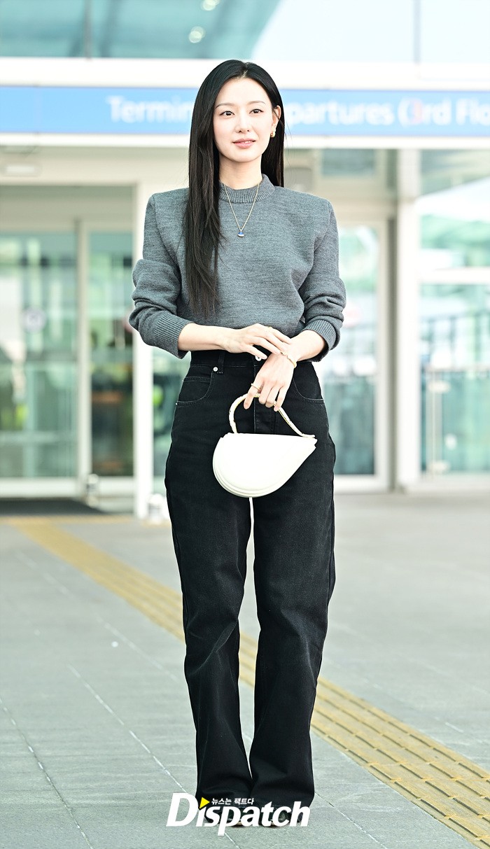 김지원은 그레이 컬러의 니트와 블랙진으로 캐주얼한 공항패션을 연출했다. 청순한 비주얼과 러블리한 미소가 돋보였다.