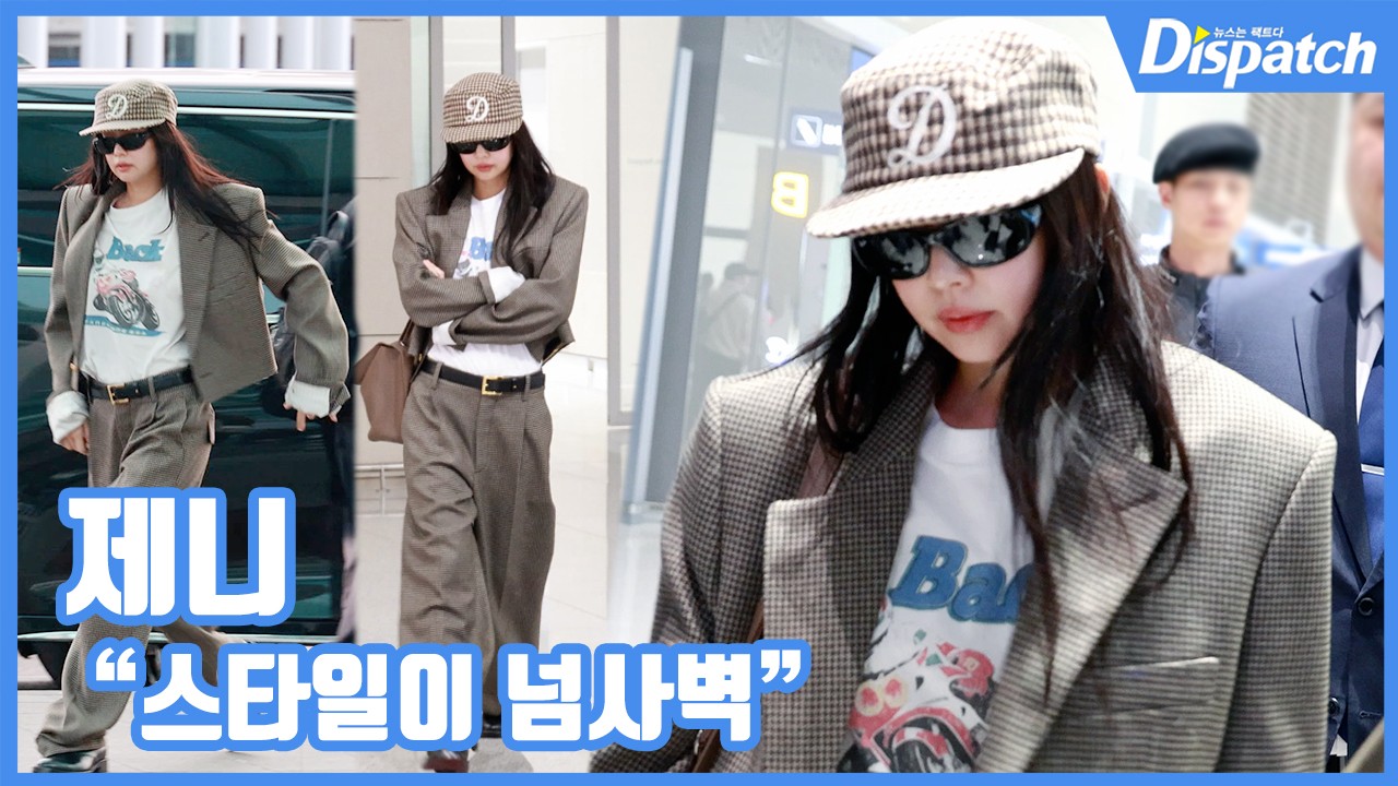 이날 제니는 브라운 체크무늬 재킷, 팬츠, 스냅백 모자를 매치한 톰보이 느낌의 공항패션을 선보였다.