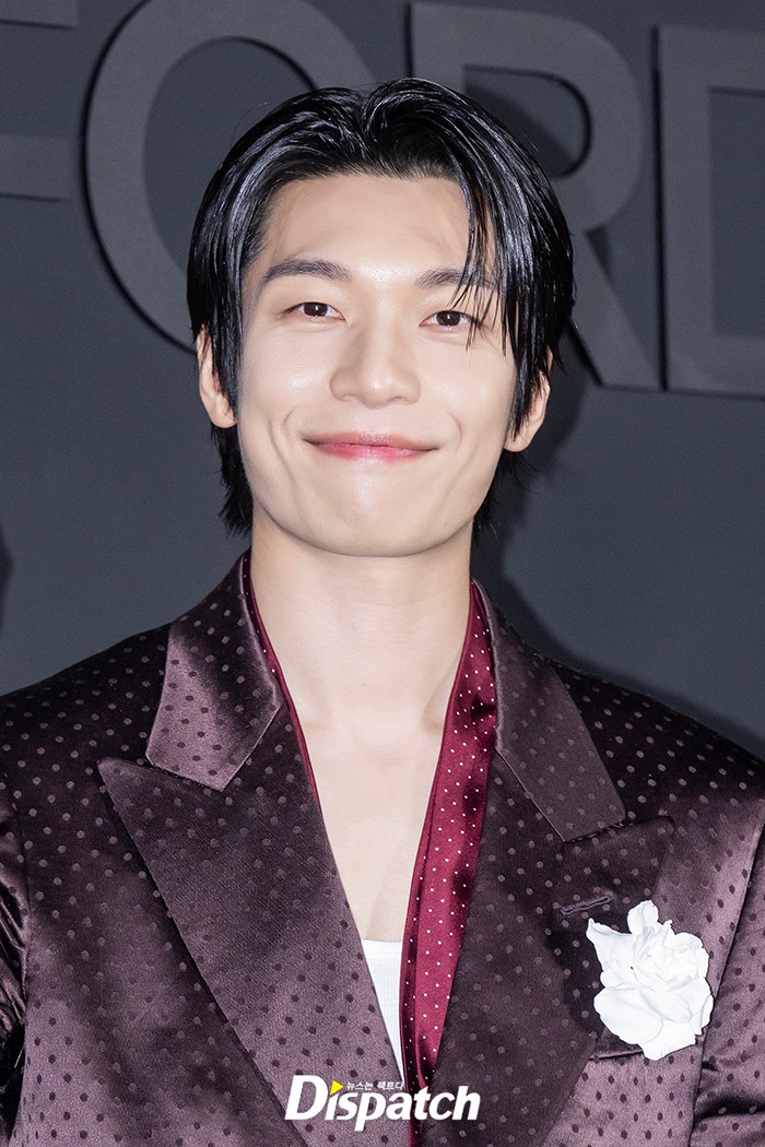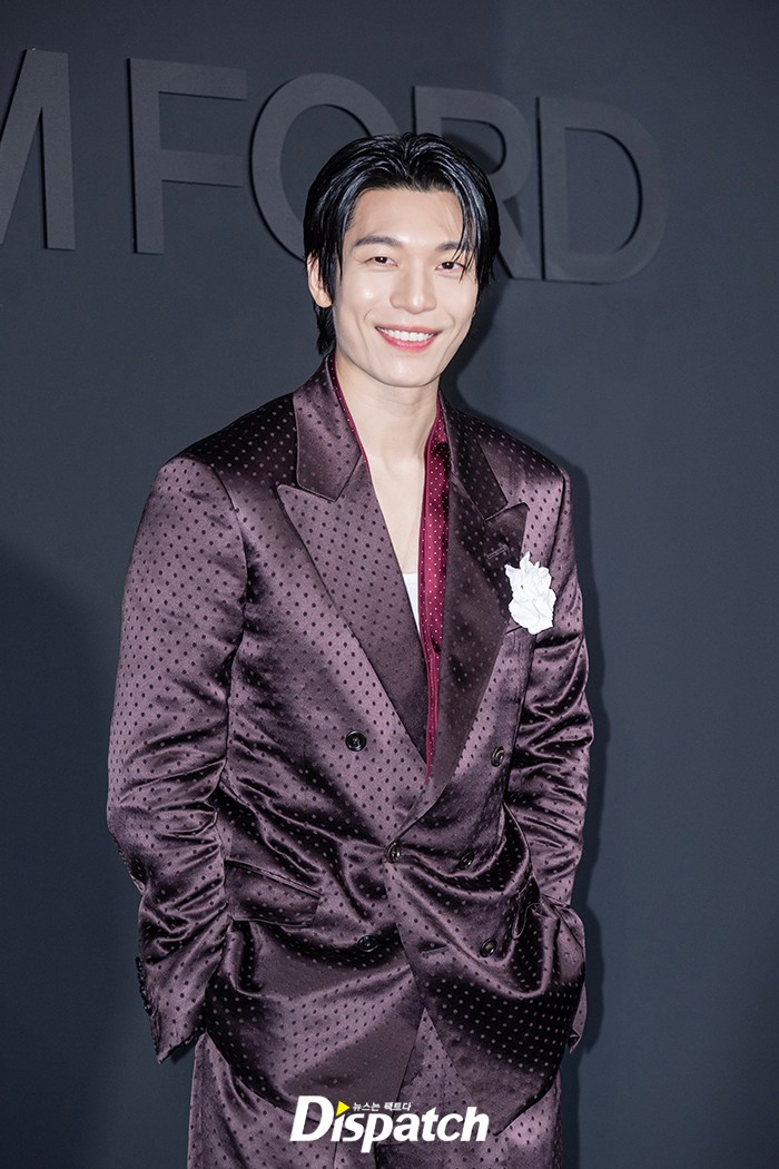 위하준은 와인빛 실크 수트로 멋을 냈다. 스윗한 미소가 시선을 사로잡았다.