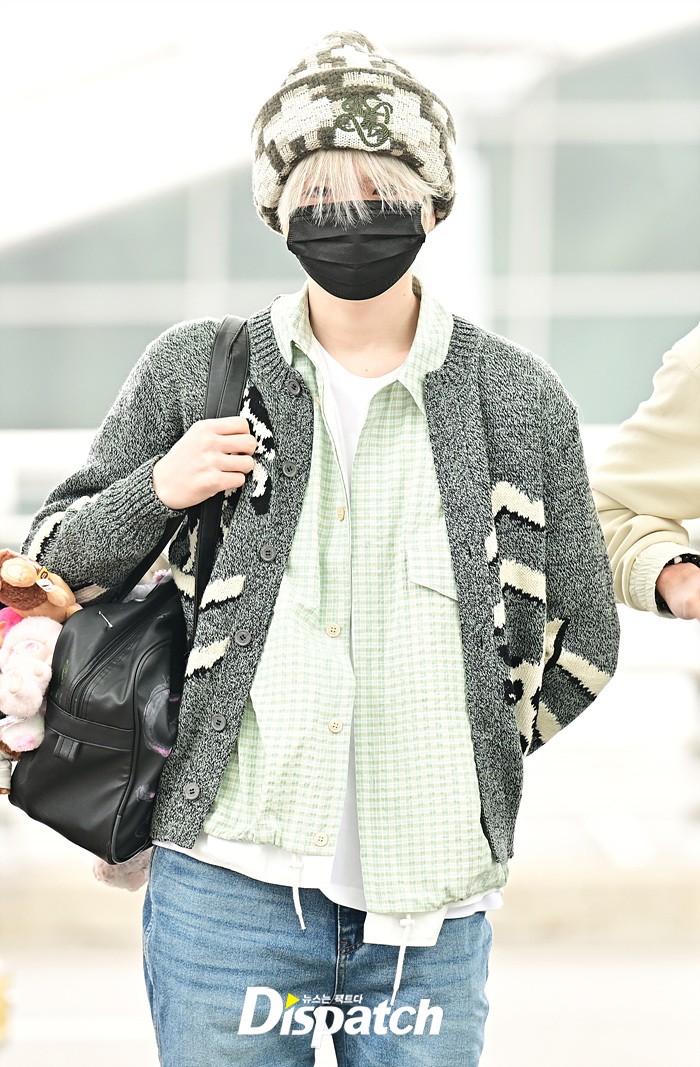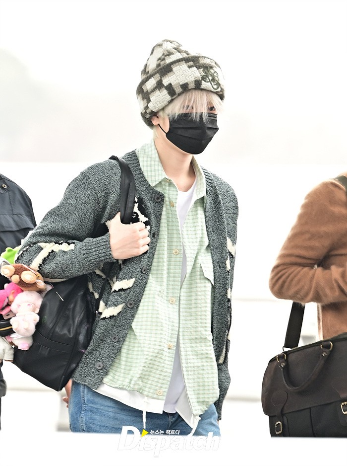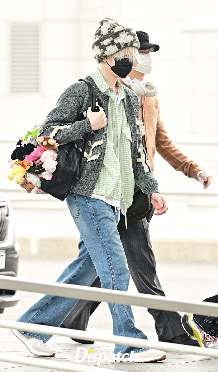 리쿠는 인형이 가득 달린 가방을 들고 출국장을 나섰다. 마스크에도 귀여운 이미지가 돋보였다.