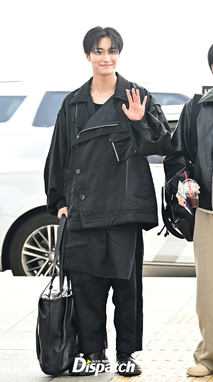 성화는 올블랙 스타일로 시크한 매력을 뽐냈다. 공항에 모인 팬들을 위해 스윗한 미소로 화답했다.