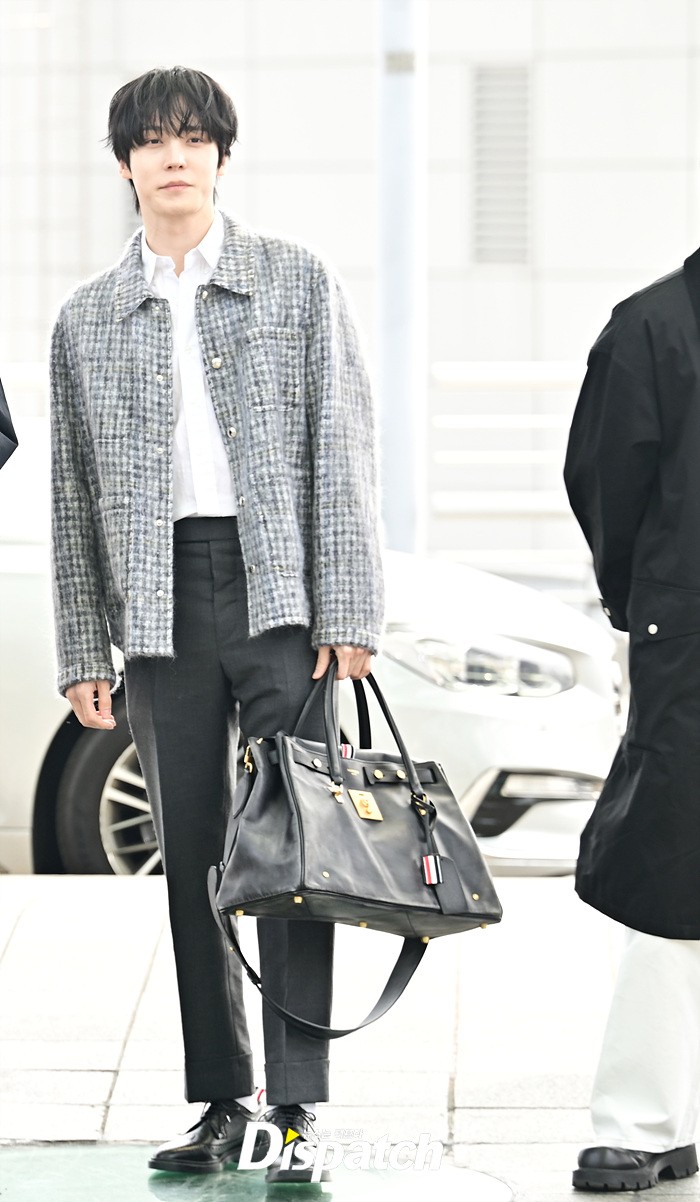 윤호는 체크 패턴의 재킷과 슬렉스로 댄디한 공항패션을 완성했다. 큰 키와 작은 얼굴, 또렷한 이목구비도 돋보였다.