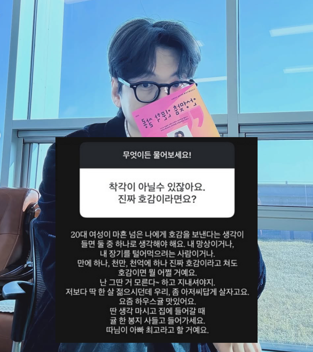 지난해에는 고민상담 글(DM)을 박제, '영포티'를 훈계했다. "20대 여성이 마흔 넘은 남성을 좋아할 수 없다"며 "우리 좀 아저씨답게 살자고요"라고 일침했다.