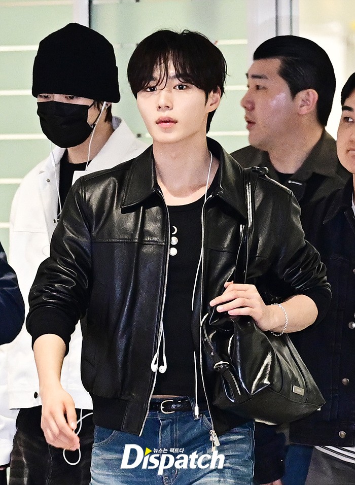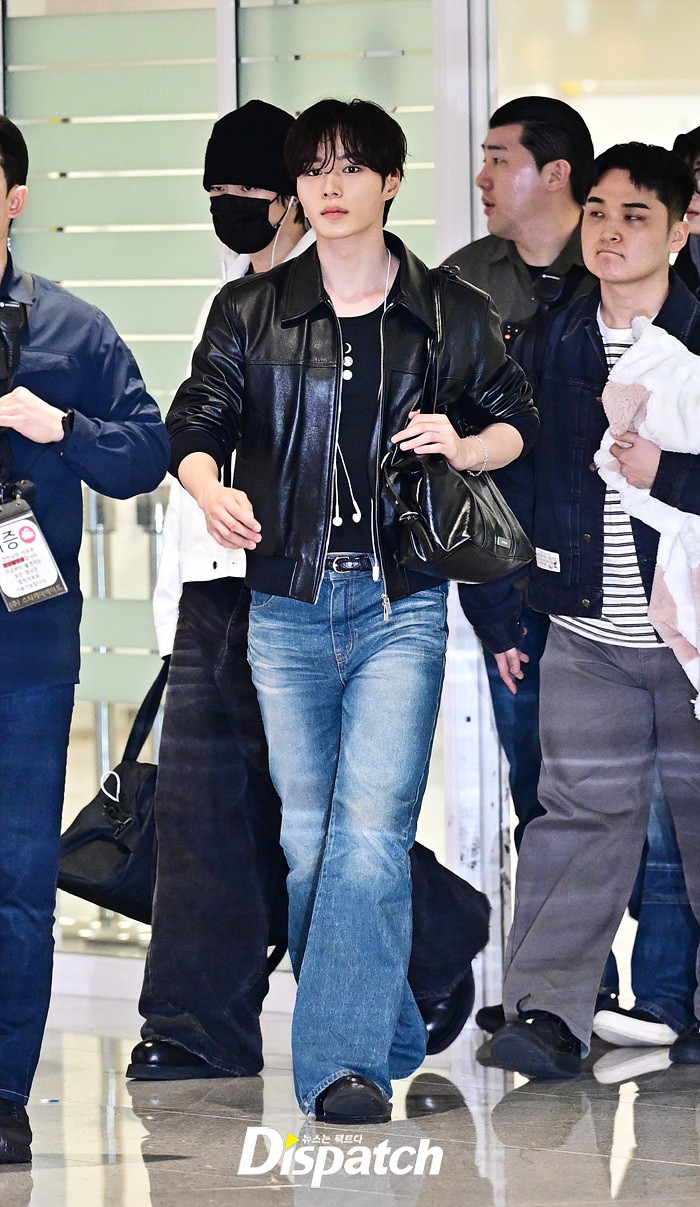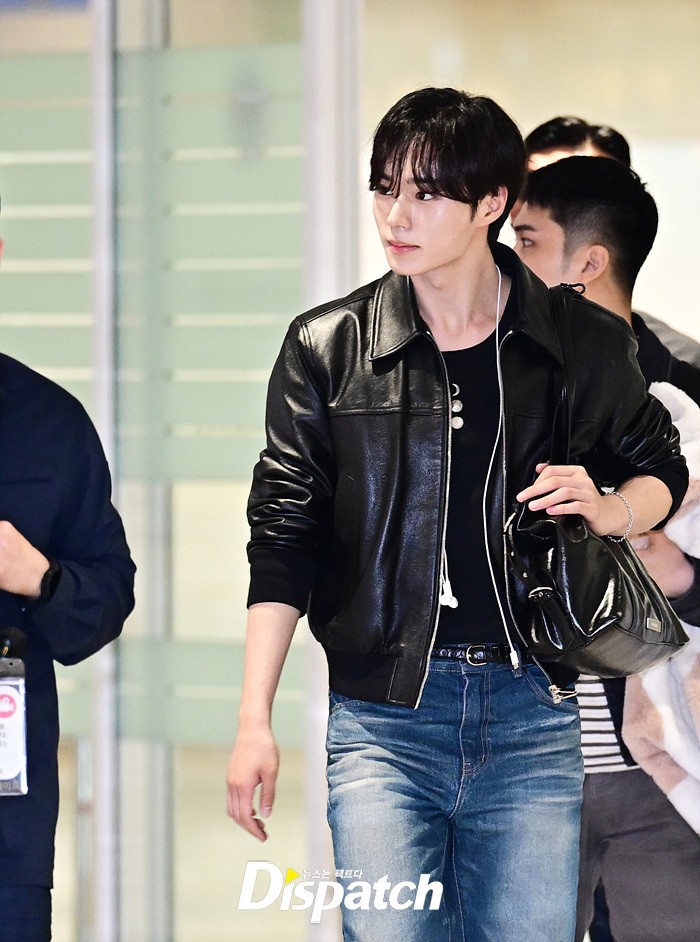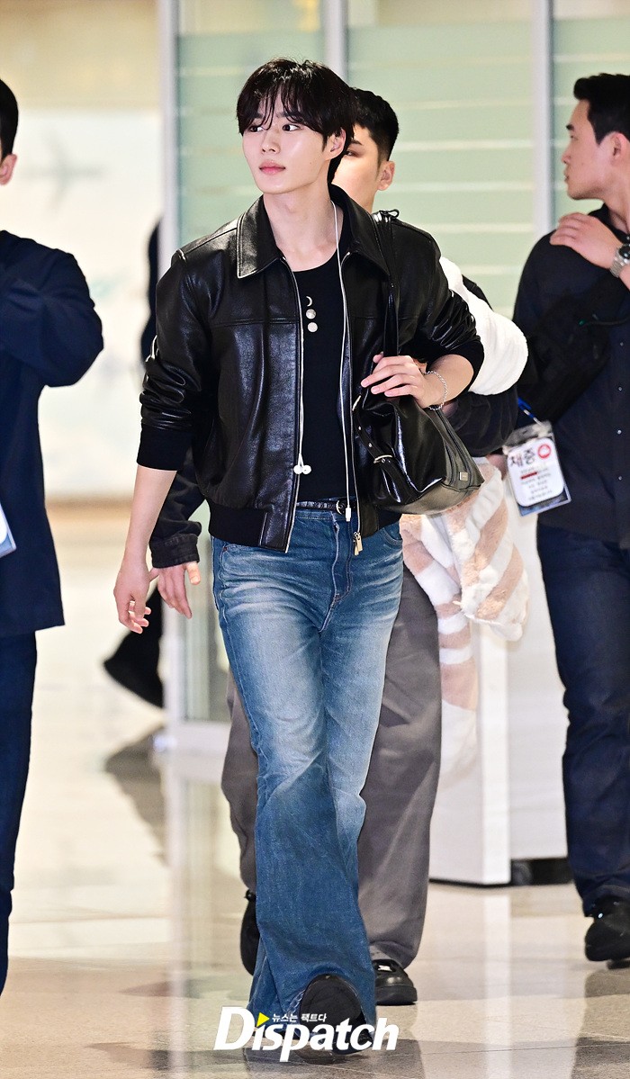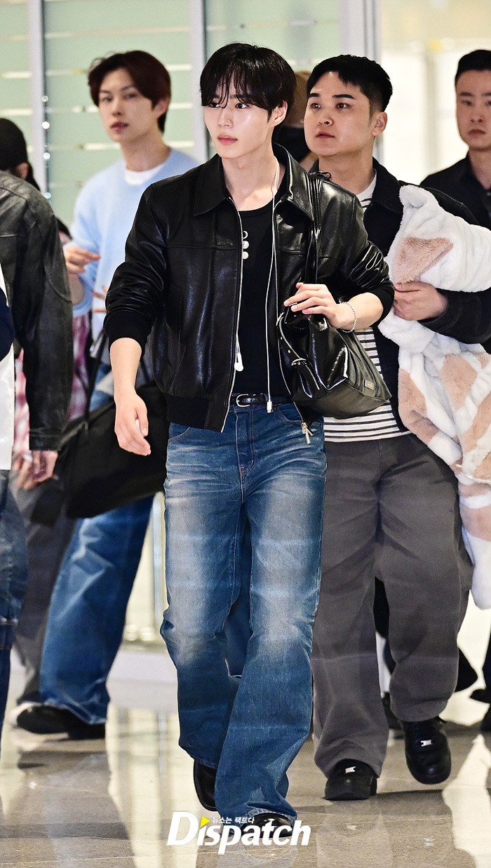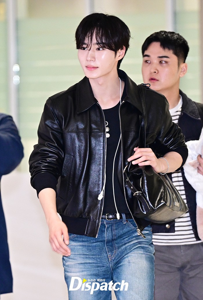 준서는 가죽 재킷과 데님진으로 캐주얼한 공항패션을 연출했다. 훈훈한 비주얼과 스윗한 미소도 돋보였다.