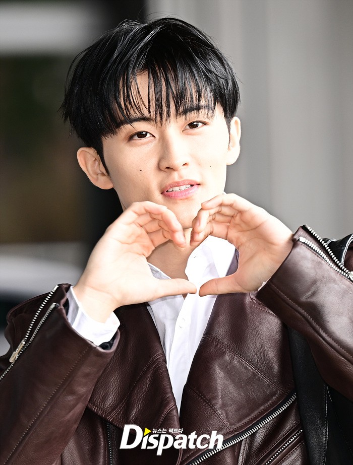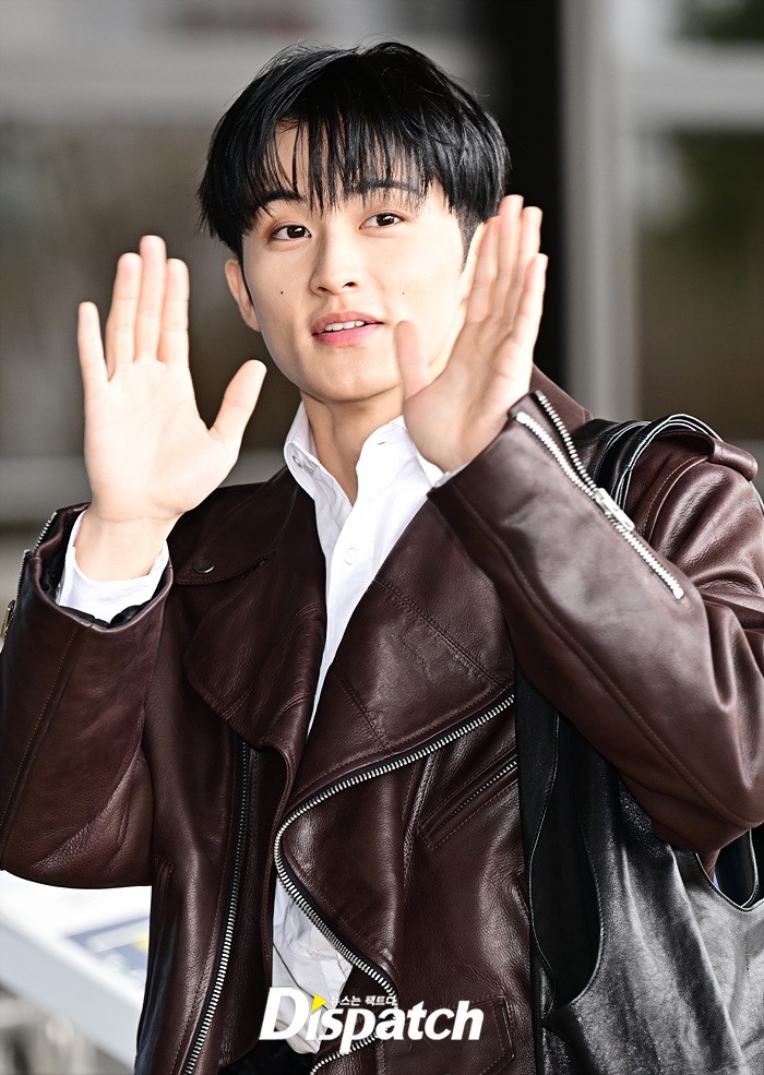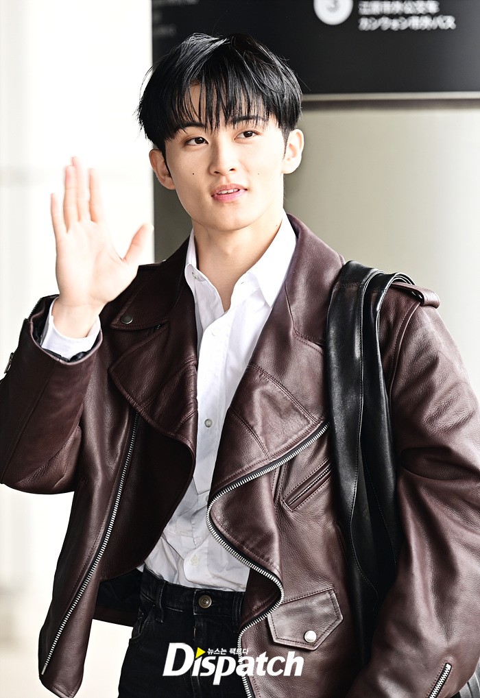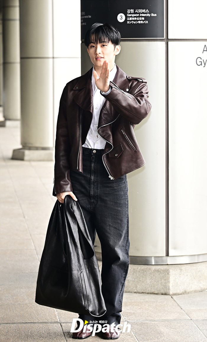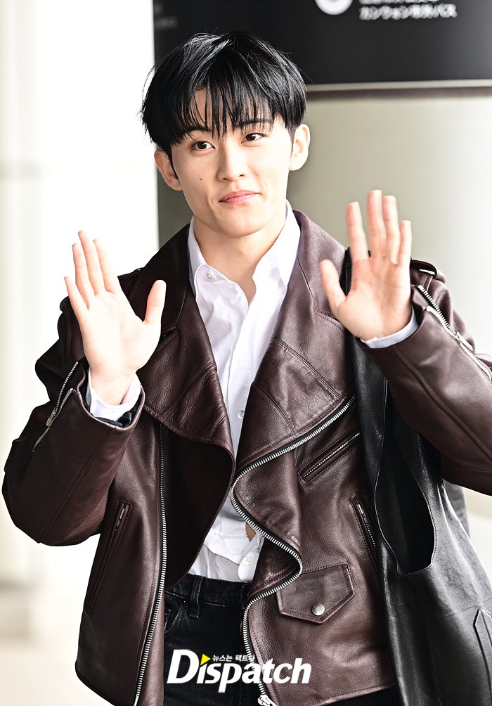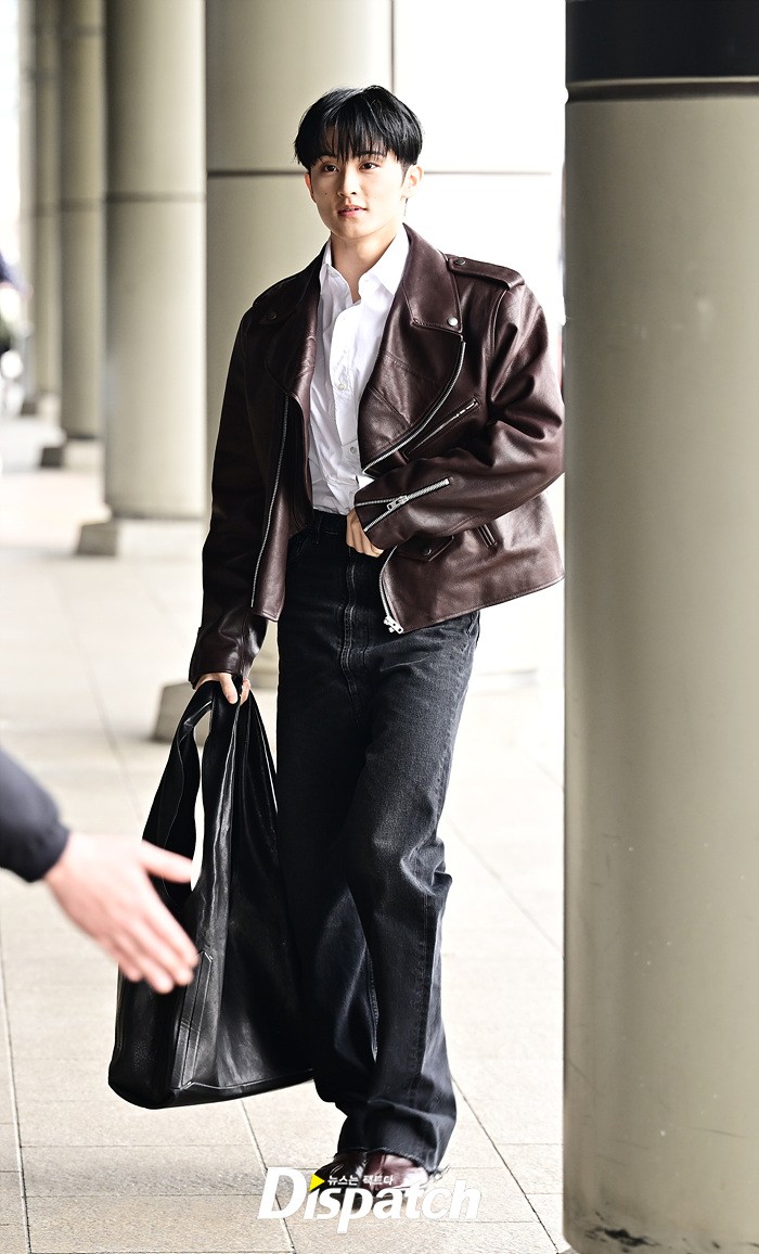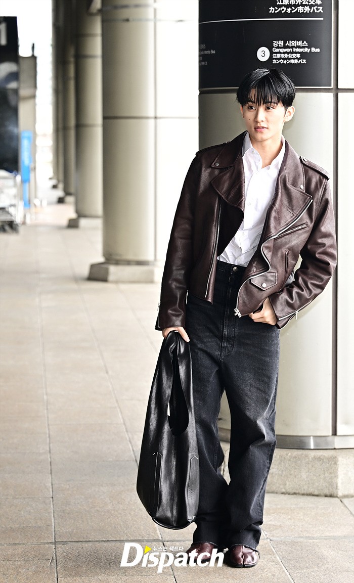 마크는 브라운 컬러의 가죽 재킷과 블랙진으로 세련된 공항패션을 완성했다. 다양한 포즈로 러블리한 매력도 어필했다.