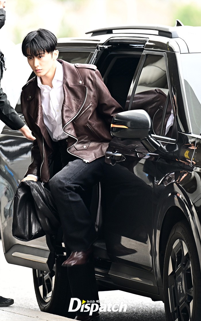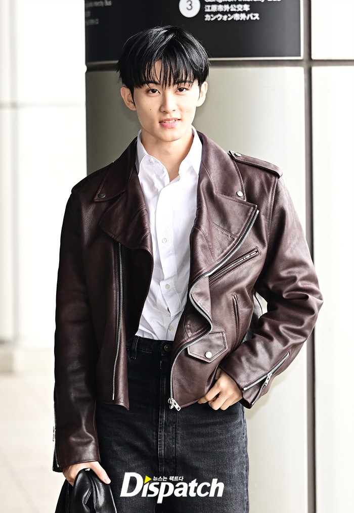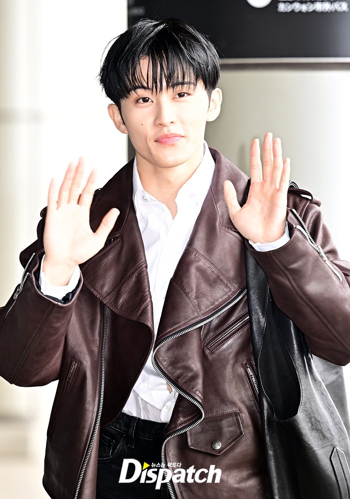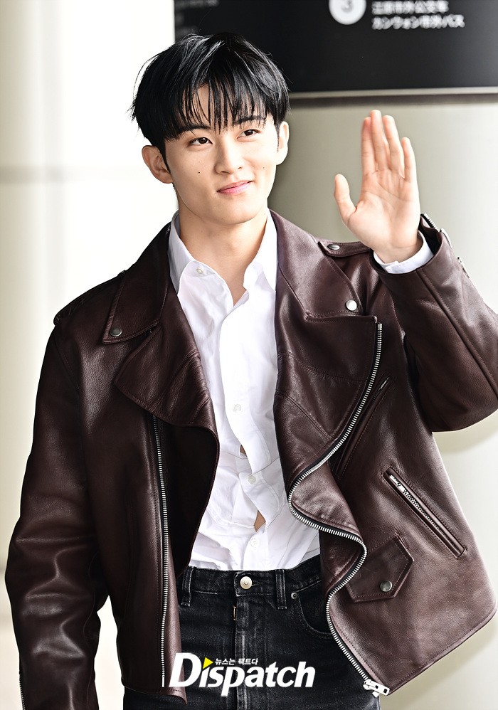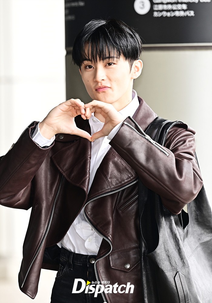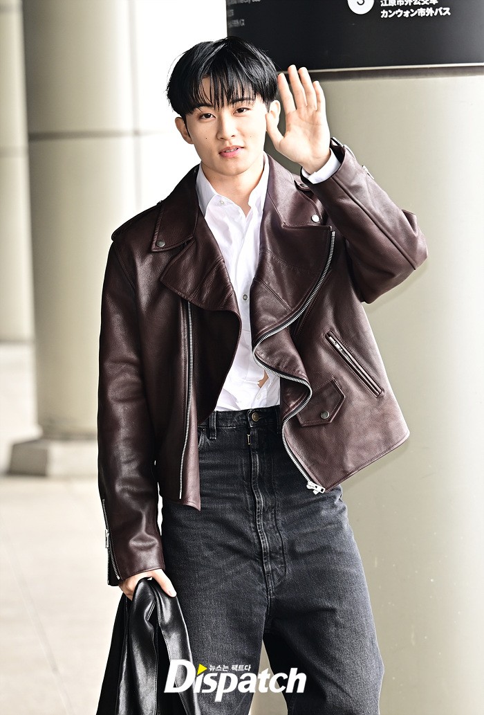 마크는 브라운 컬러의 가죽 재킷과 블랙진으로 세련된 공항패션을 완성했다. 다양한 포즈로 러블리한 매력도 어필했다.