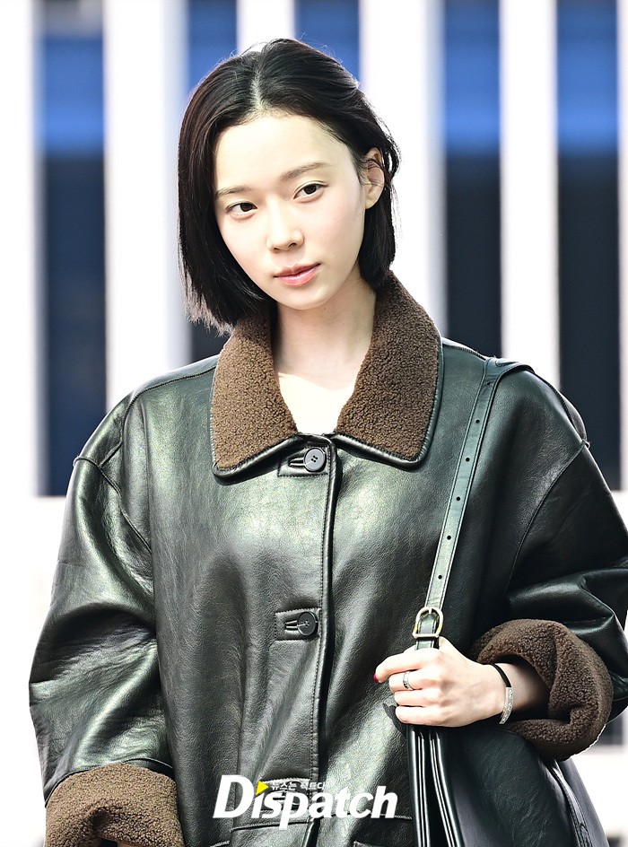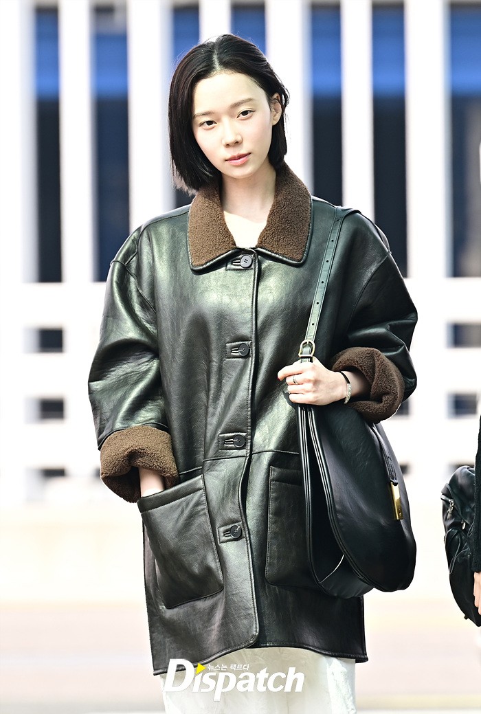 윈터는 가죽 소재의 코트와 화이트 스커트로 독특한 패션센스를 뽐냈다. 화장기 없는 얼굴에도 청순한 비주얼이 돋보였다.