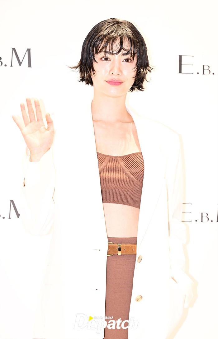 나나는 화이트 컬러의 재킷과 브라운 스커트로 세련된 스타일링을 선보였다. 아찔한 탑 상의는 섹시미를 더했다.
