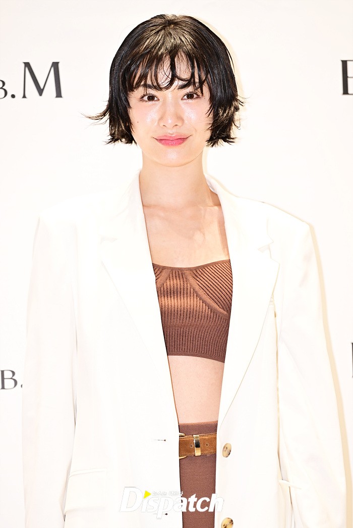 나나는 화이트 컬러의 재킷과 브라운 스커트로 세련된 스타일링을 선보였다. 아찔한 탑 상의는 섹시미를 더했다.