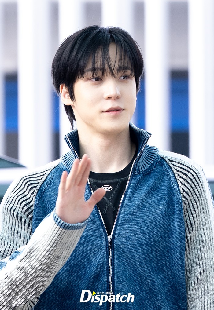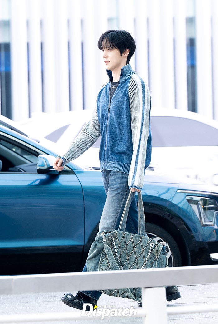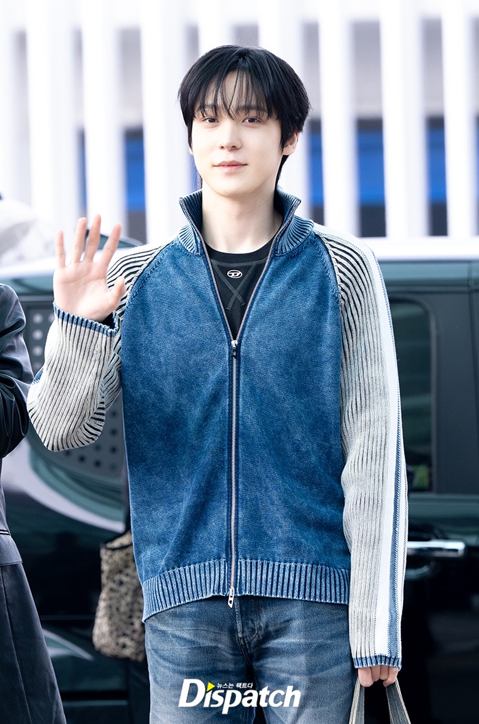윤호는 블루 짚업니트와 청바지로 멋을 냈다. 완벽한 비주얼로 공항을 빛냈다.
