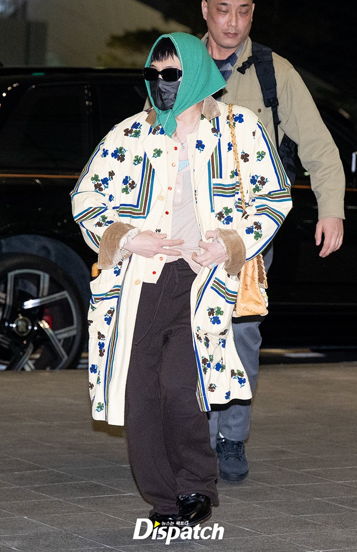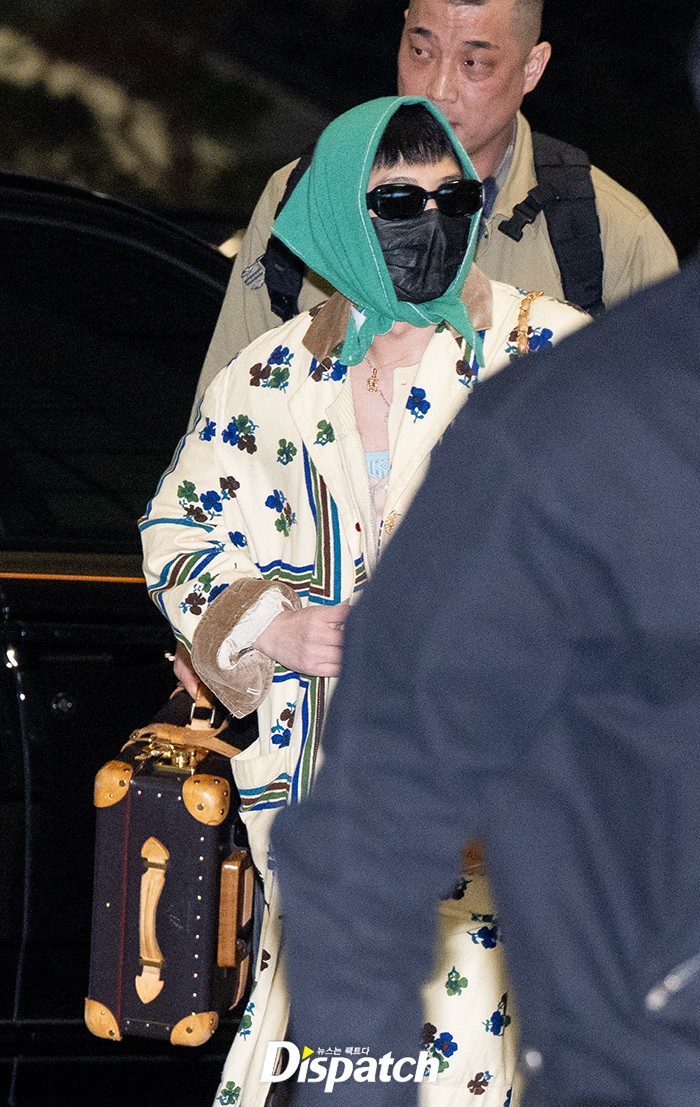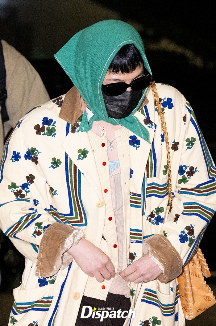 지드래곤은 화려한 프린트의 상의와 두건으로 스타일을 완성했다. 멋진 패션으로 공항의 이목을 집중시켰다.