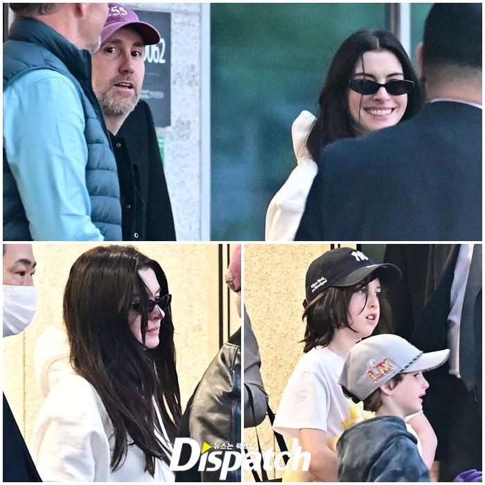 앤 해서웨이는 남편 애덤 셜먼, 그리고 두자녀와 함께 입국장에 모습을 드러냈다. 밝은 미소로 등장한 앤은 팬들에게 환한 손인사로 화답했다.