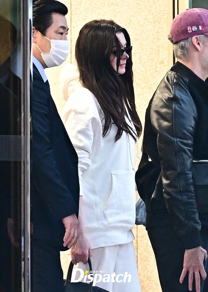 앤 해서웨이는 남편 애덤 셜먼, 그리고 두자녀와 함께 입국장에 모습을 드러냈다. 밝은 미소로 등장한 앤은 팬들에게 환한 손인사로 화답했다.