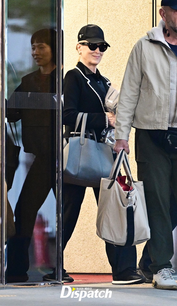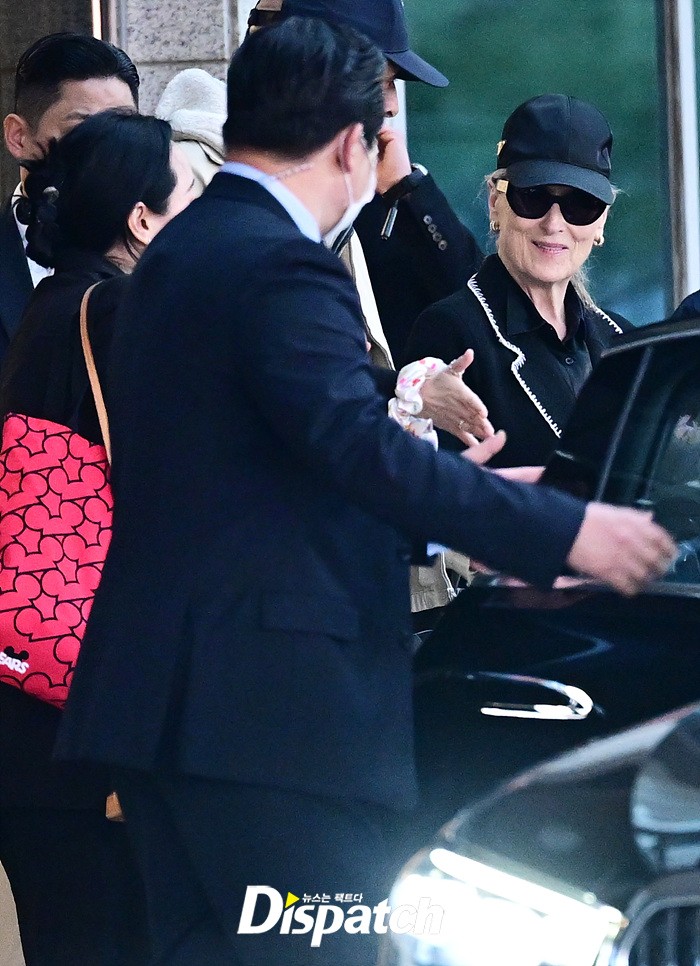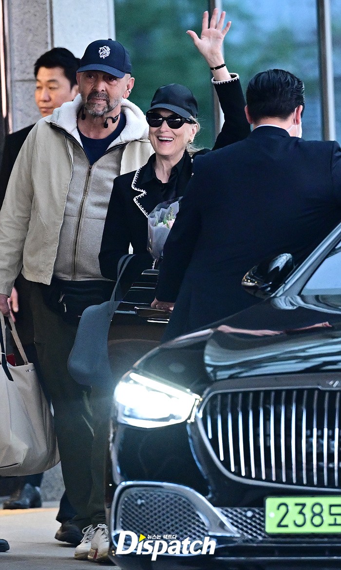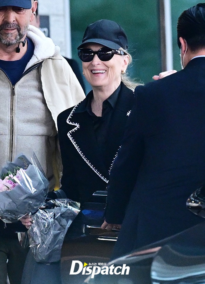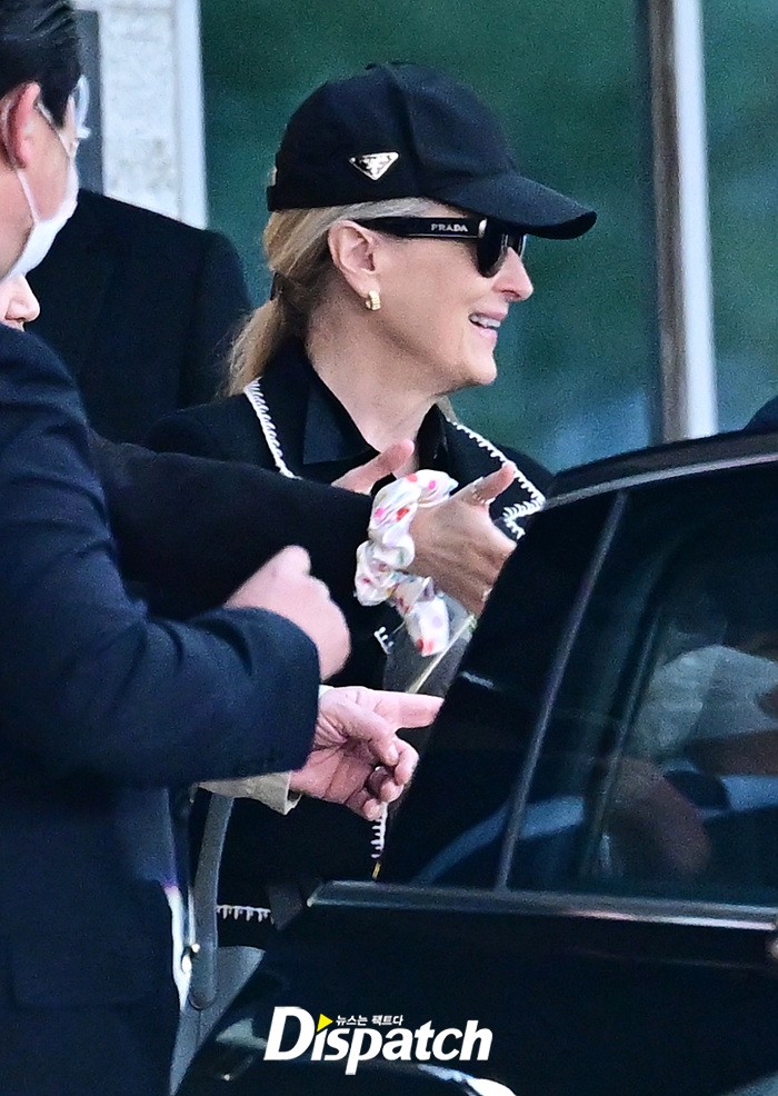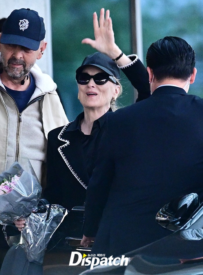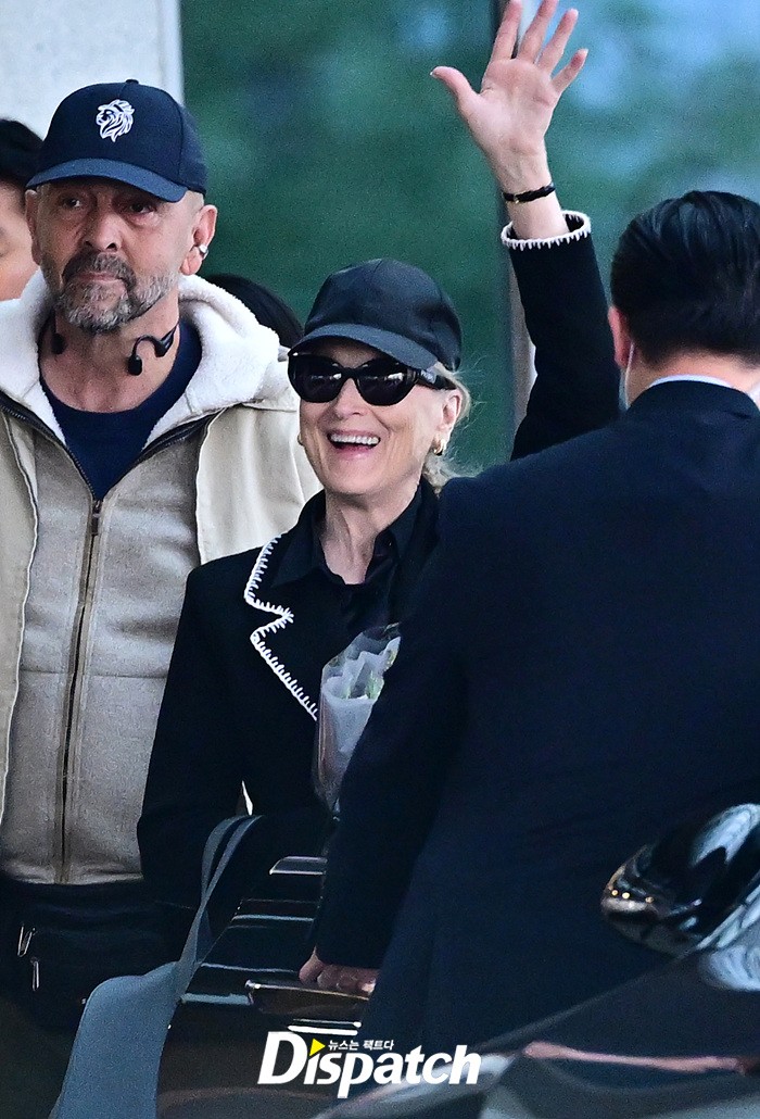 메릴 스트립은 공항에 모인 팬들을 위해 환한 손인사로 화답했다. 블랙 컬러의 재킷과 모자, 선글라스로 연출한 세련된 스타일링도 눈길을 끌었다.