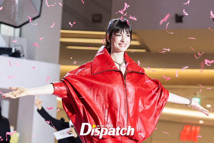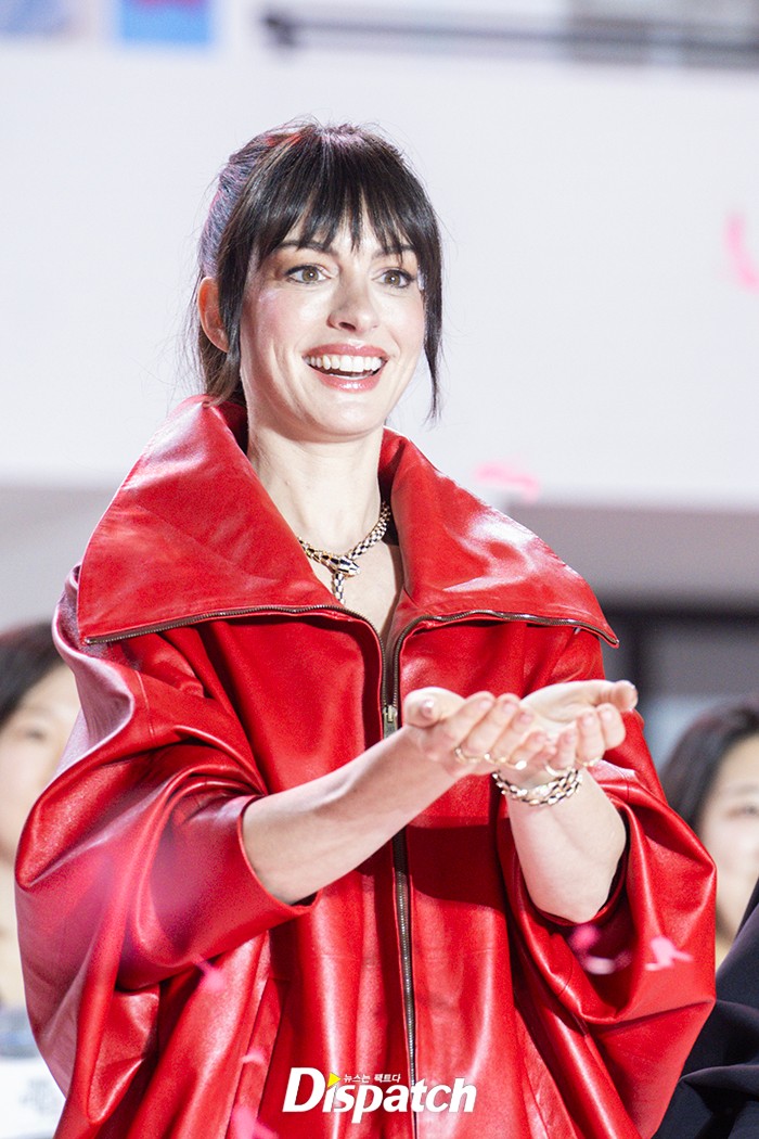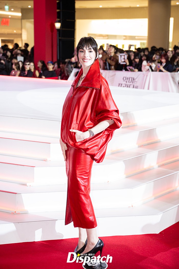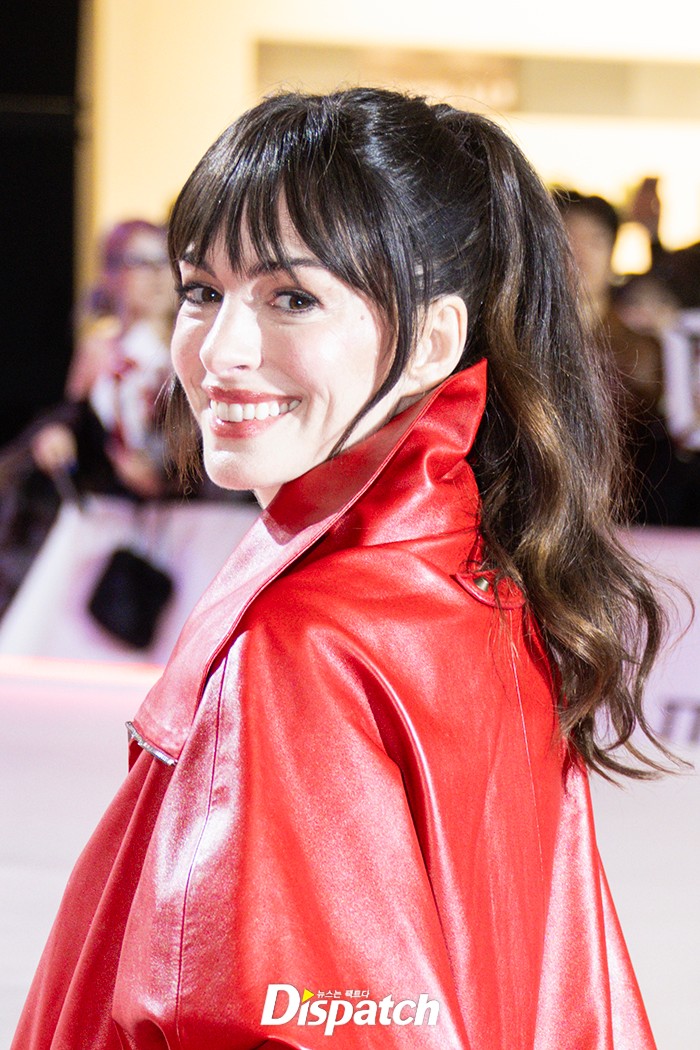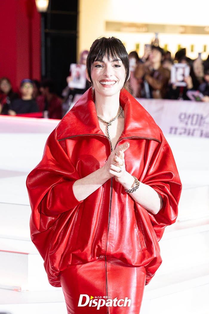 앤 해서웨이는 새빨간 레더 원피스로 아름다움을 뽐냈다. 시원한 미소로 팬들의 환호에 화답했다.