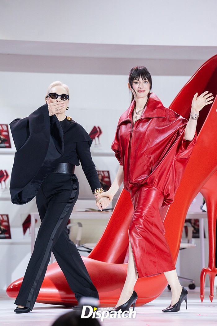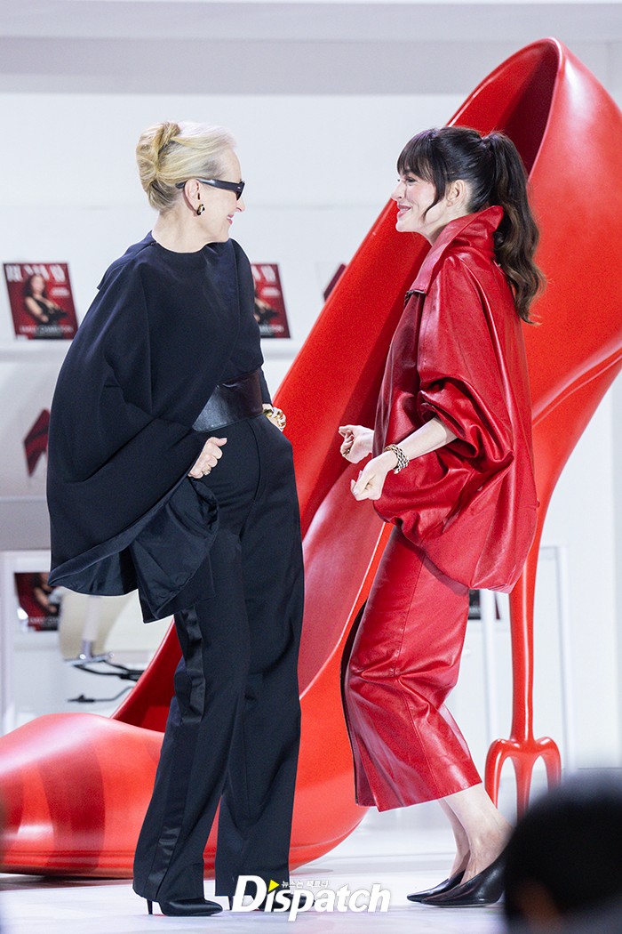 메릴 스트립과 앤 해서웨이는 블랙&레드룩으로 멋을 냈다. 무대 위에서 가벼운 댄스타임을 가지며 팬들의 환호에 답했다.