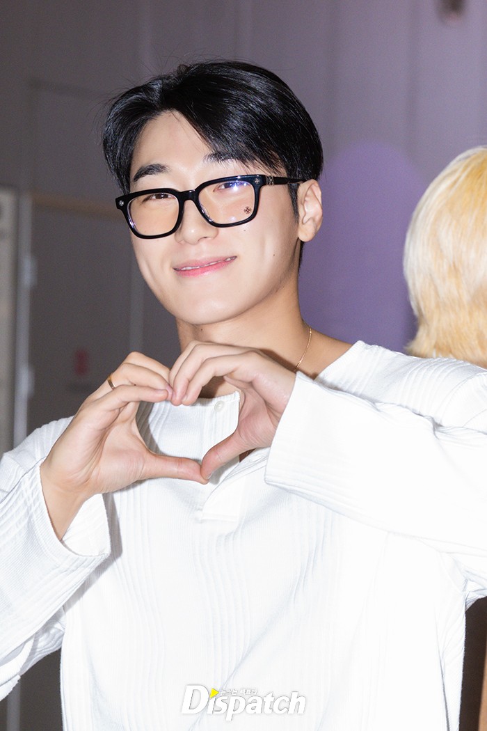 산은 화이트 티셔츠와 브라운 팬츠로 멋을 냈다. 취재진을 향해 하트 포즈를 취했다.