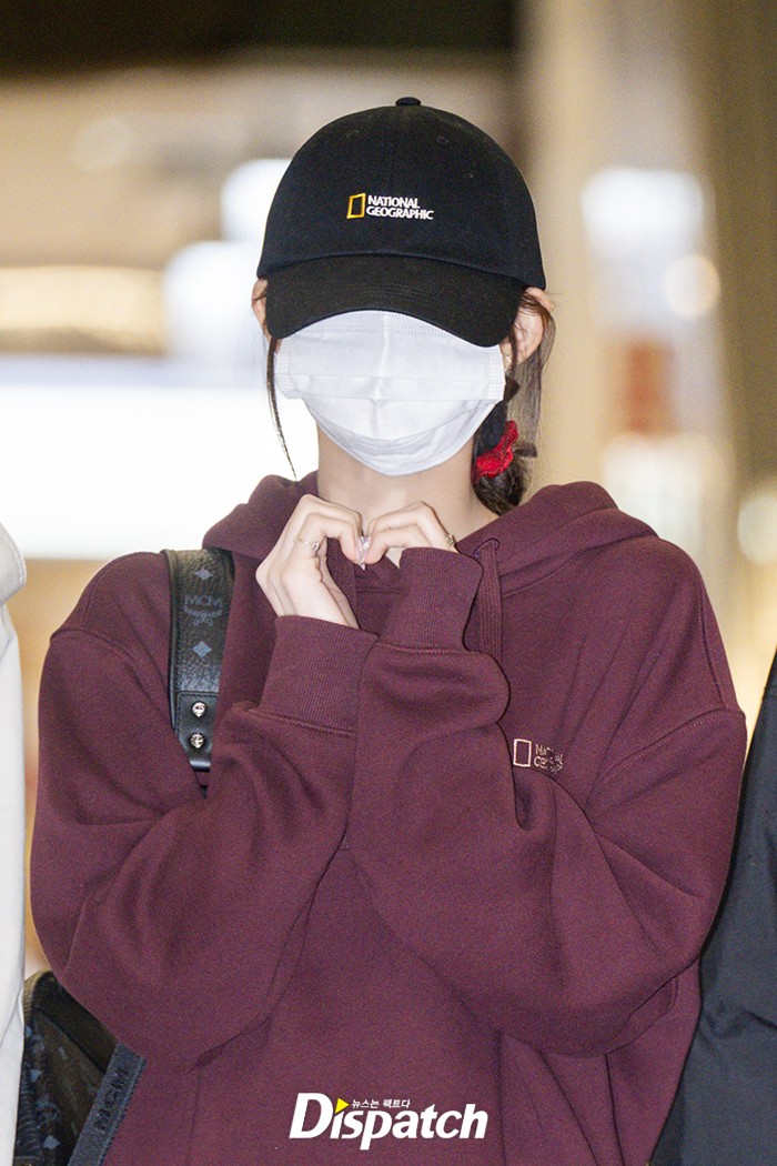 이서는 버건디 후디와 스커트로 편안한 공항패션을 완성했다. 사랑스러운 애교로 팬들에게 인사를 건넸다.