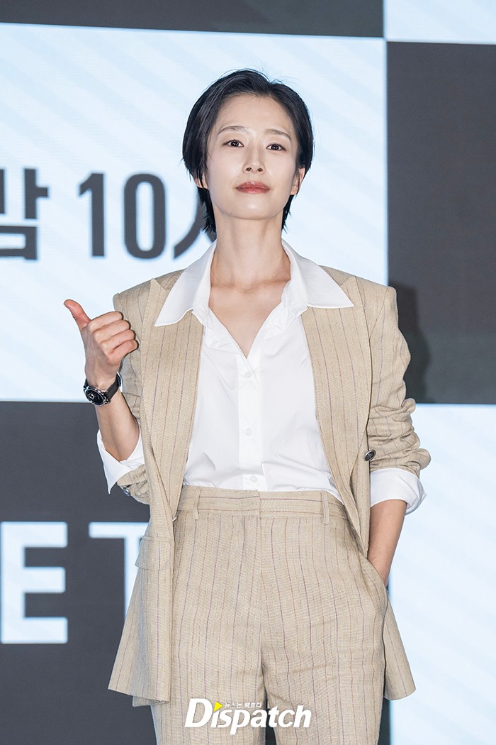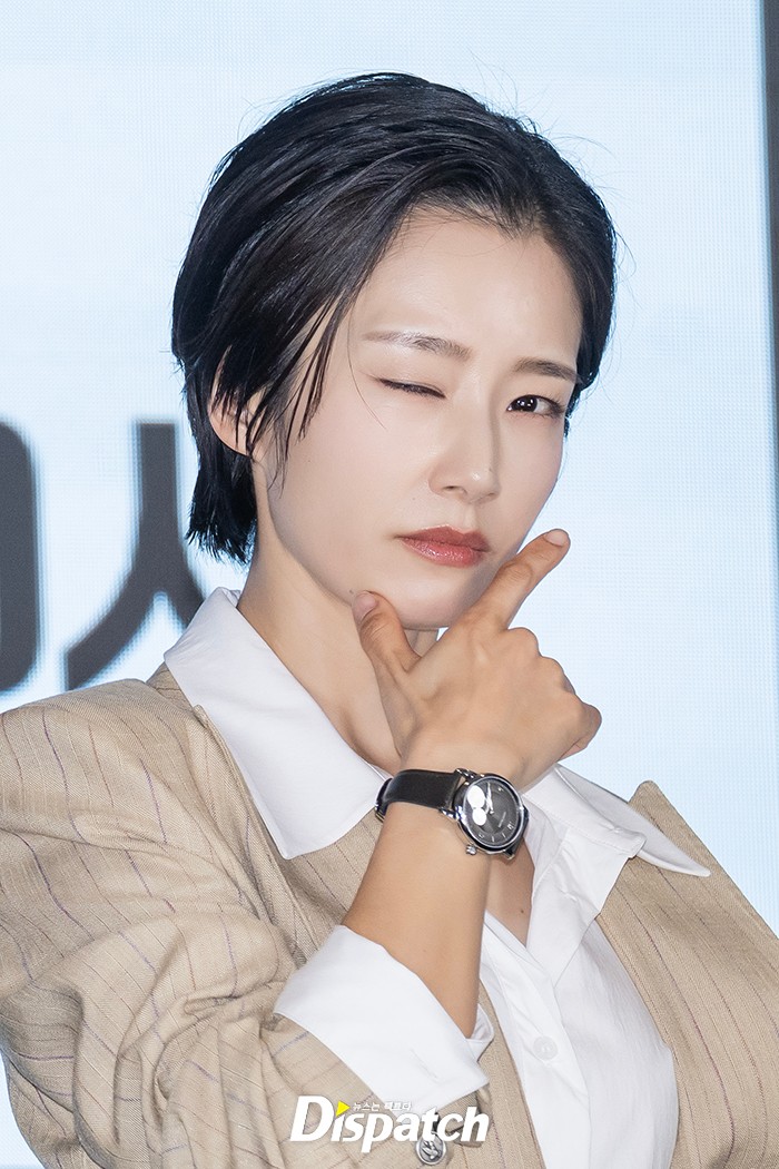 곽선영은 스트라이프 수트로 매니시룩을 뽐냈다. 숏컷 헤어스타일과 강렬한 눈빛으로 걸크러쉬 분위기를 완성했다.