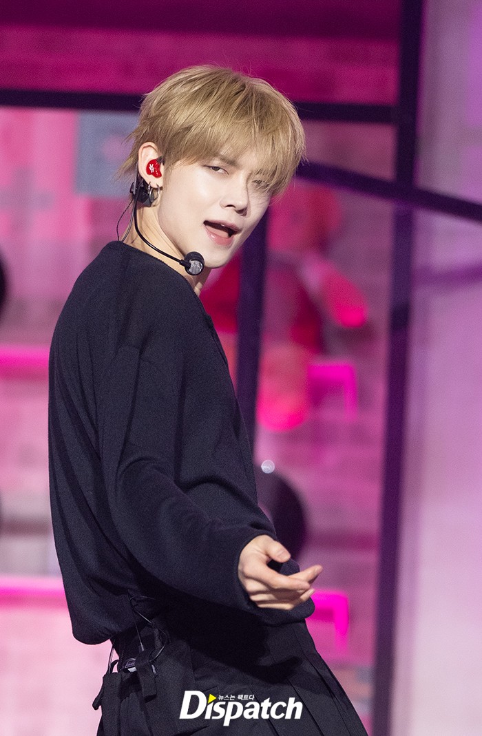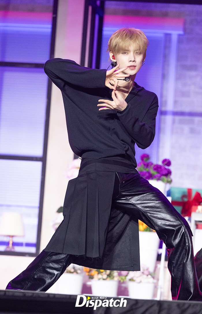 연준은 네이비 니트와 가죽팬츠로 남성미를 뽐냈다. 강력하고 멋진 무대로 시선을 사로잡았다.