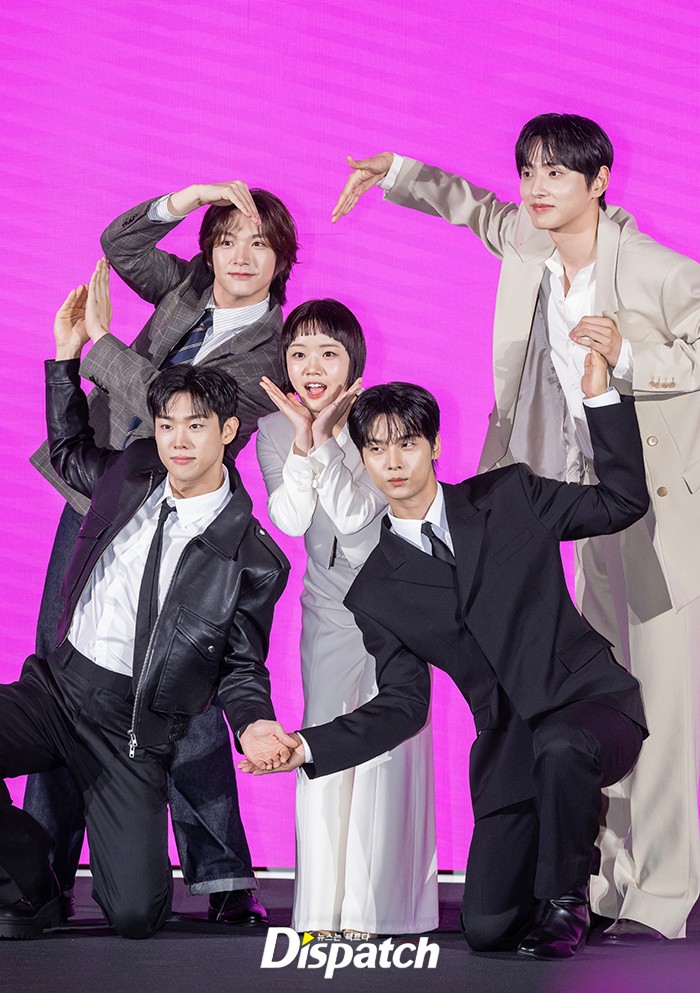김향기, 차학연, 김재현, 손정혁, 김동규가 단체 포즈로 대형 하트를 완성하고 있다.