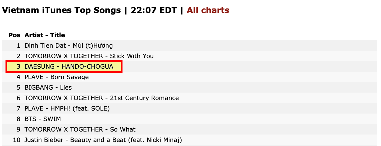 아이튠즈 최신 차트(4월 14일 자)에 따르면, 대성의 '한도초과'가 베트남 톱 송 차트 3위에 올랐다. 카타르 등 여러 국가에서도 순위권에 진입했다.