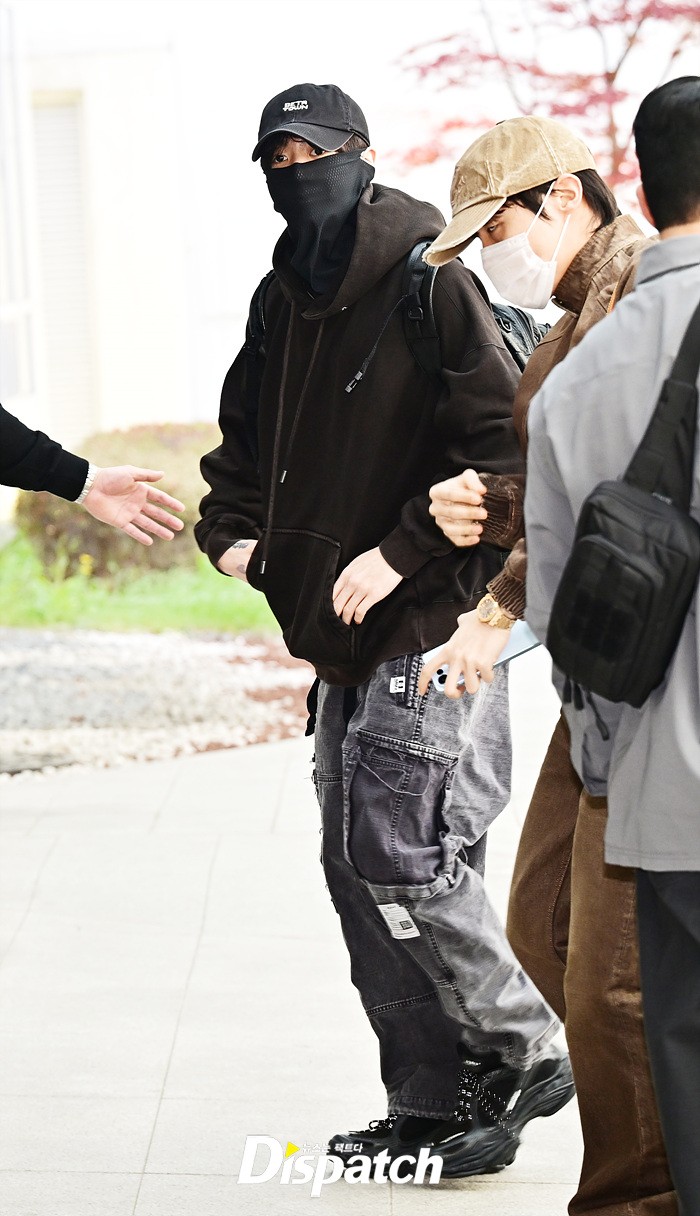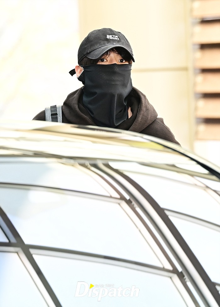 정국은 블랙 컬러의 후드와 데님 카고팬츠로 힙한 스타일링을 선보였다. 마스크에도 훈훈한 비주얼이 돋보였다.