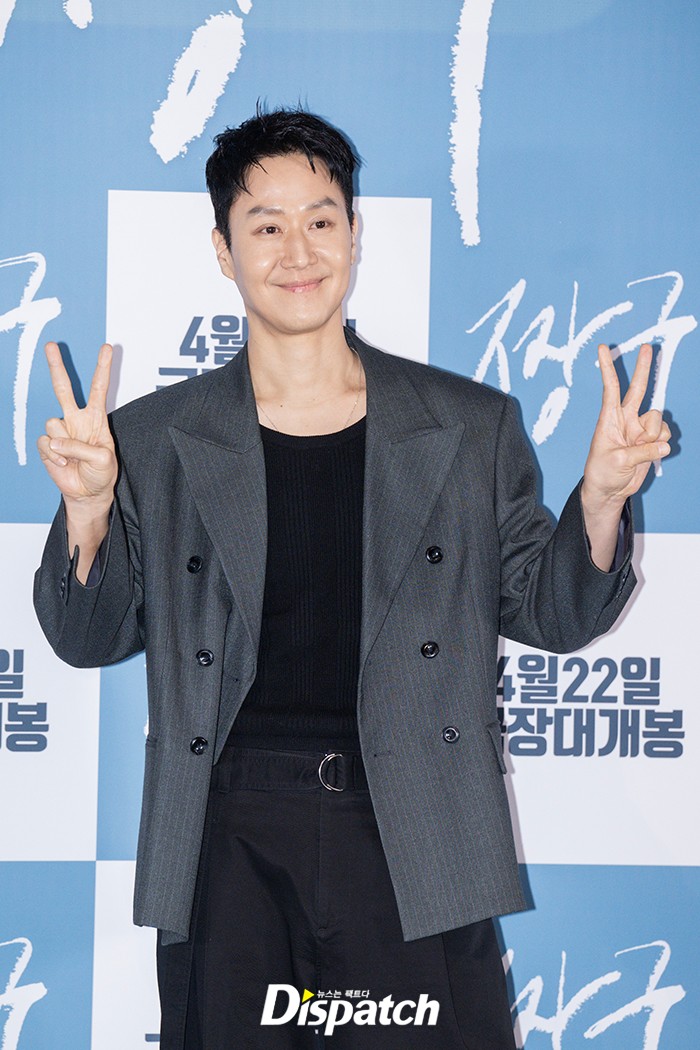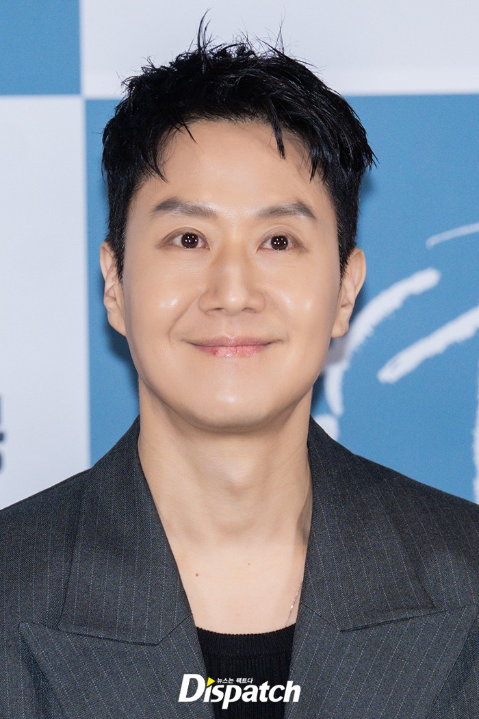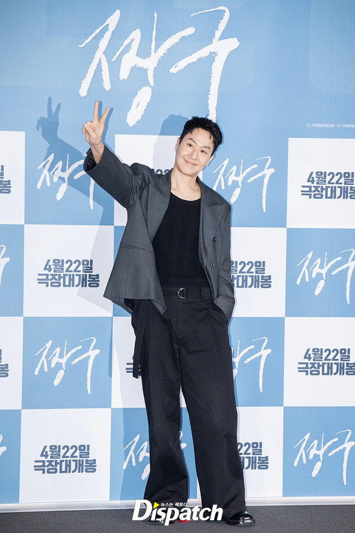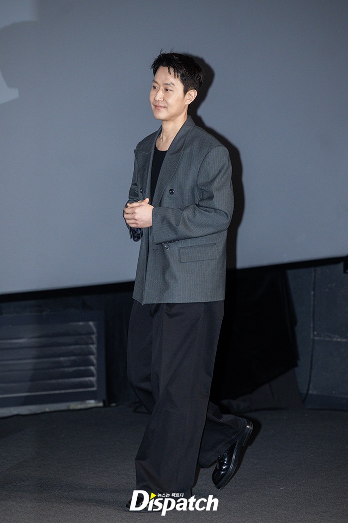정우는 그레이 스트라이프 재킷과 블랙 팬츠로 멋을 냈다. 부드러운 미소가 시선을 사로잡았다.