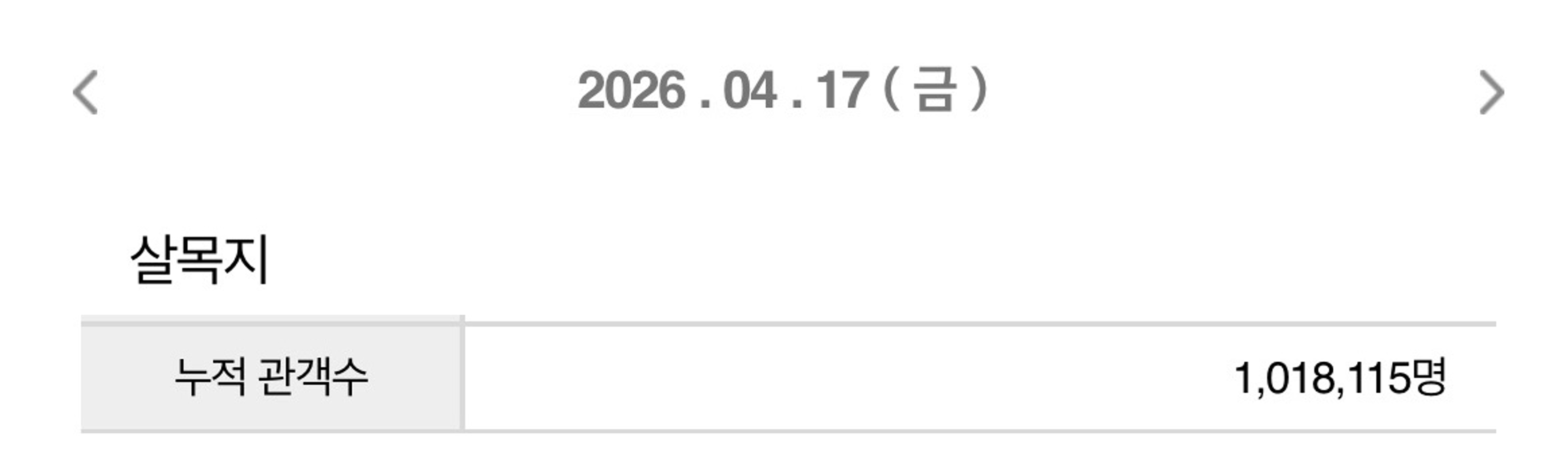 17일 영화진흥위원회 통합전산망에 따르면, '살목지'는 이날 오전까지 101만 8,115명이 관람했다. 개봉 10일째 기록으로, 9일 연속 박스오피스 1위를 차지했다.