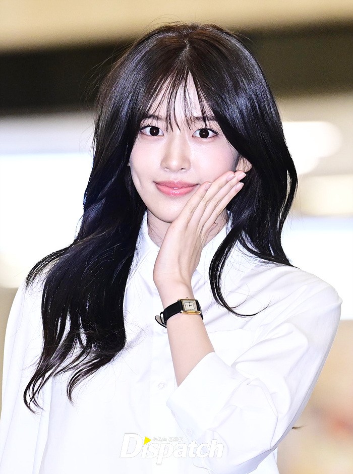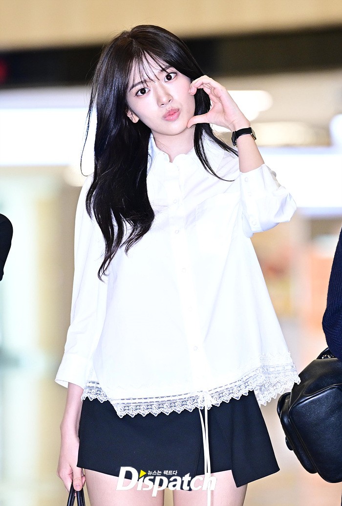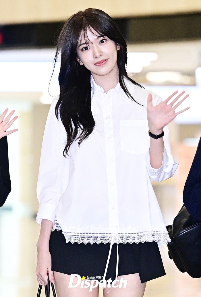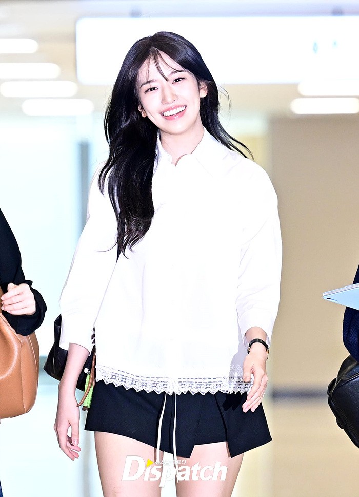 안유진은 화이트 블라우스와 블랙 미니스커트로 심플한 공항패션을 완성했다. 청순한 비주얼과 러블리한 미소도 돋보였다.