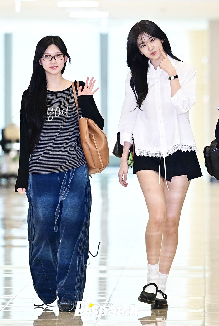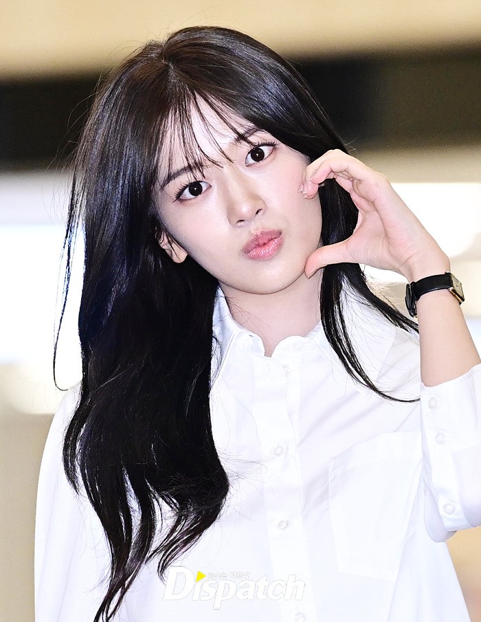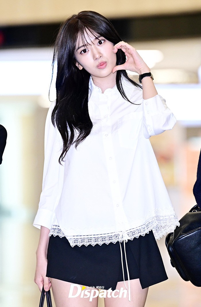 안유진은 화이트 블라우스와 블랙 미니스커트로 심플한 공항패션을 완성했다. 청순한 비주얼과 러블리한 미소도 돋보였다.