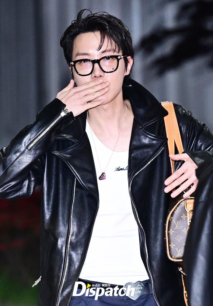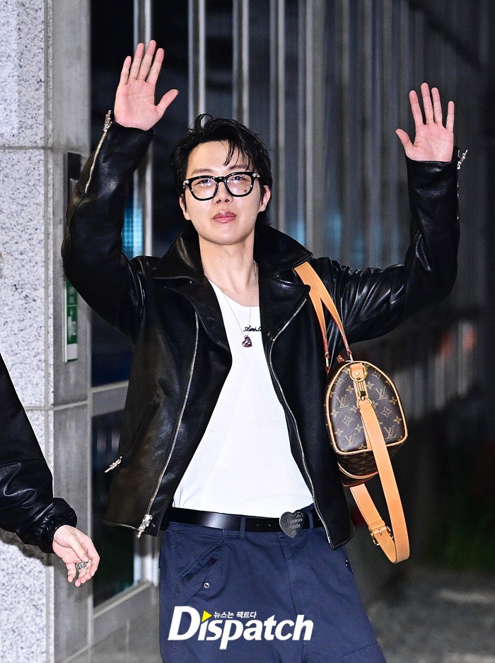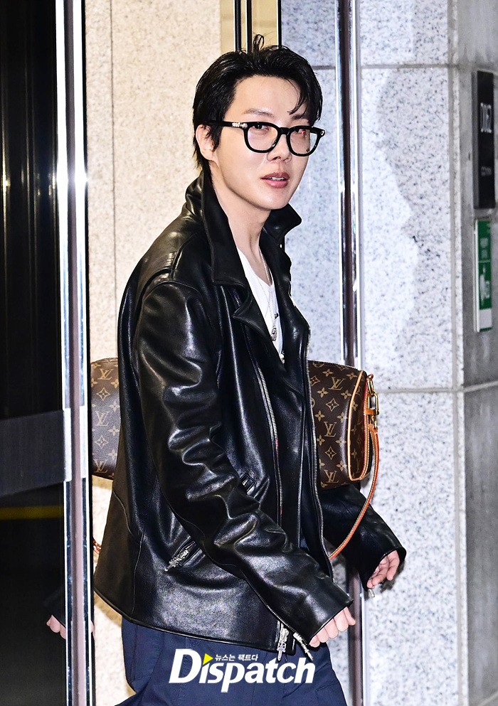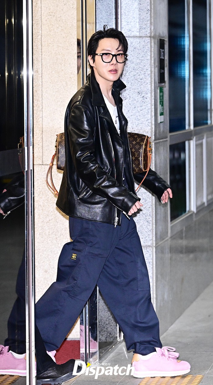 제이홉은 공항에 모인 팬들을 위해 환한 손인사로 화답했다. 핑크 컬러의 슈즈와 가죽 재킷으로 완성한 남다른 패션감각도 돋보였다.