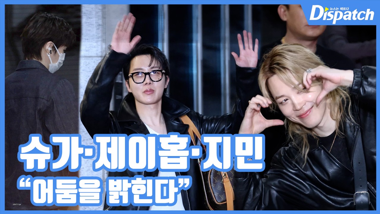'방탄소년단(BTS)' 슈가, 제이홉, 지민이 남다른 아우라로 늦은 시간 공항을 환하게 밝혔다.