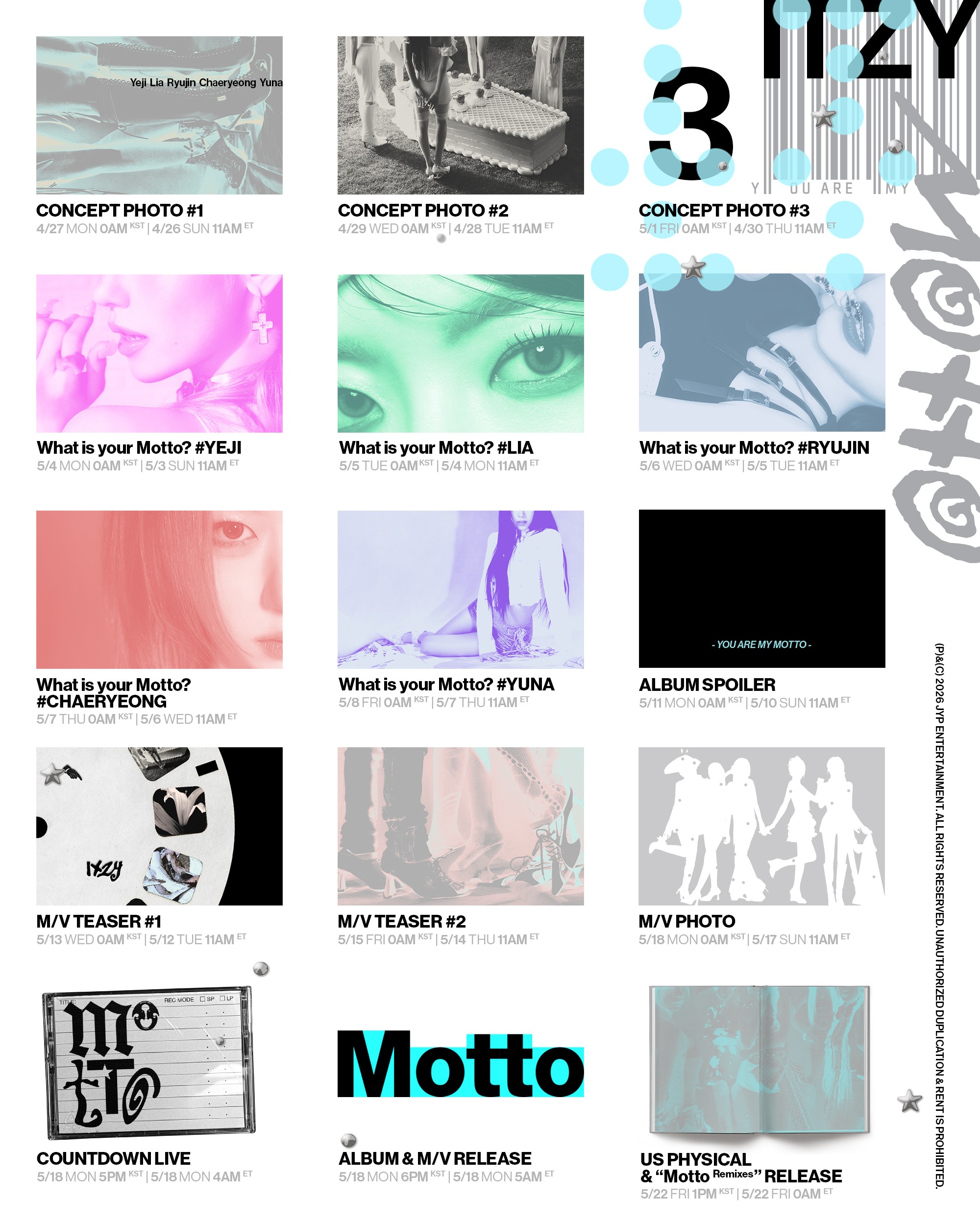 JYP엔터테인먼트는 22일 SNS에 있지 컴백 소식을 알렸다. 미니 12집 '모토'(Motto) 트레일러 및 트랙리스트, 스케줄러를 공개했다.