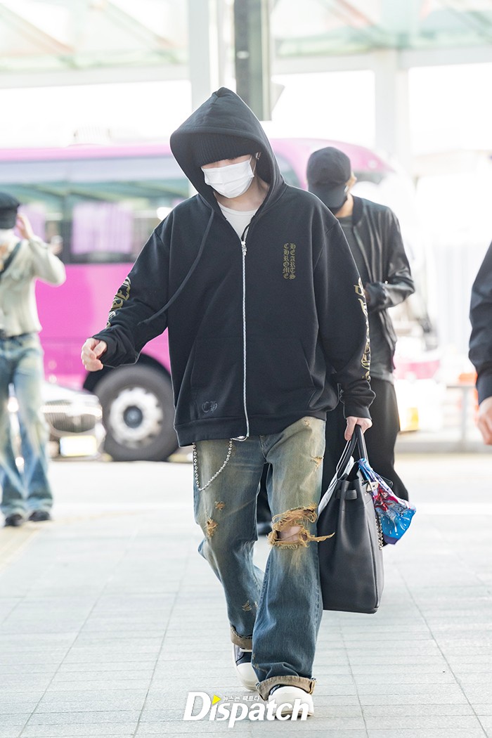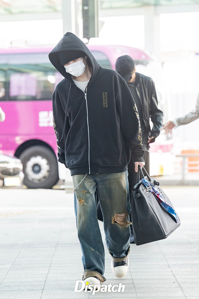 슈가는 블랙 후드집업과 데미지진으로 공항패션을 완성했다. 훈훈한 비주얼이 돋보였다.