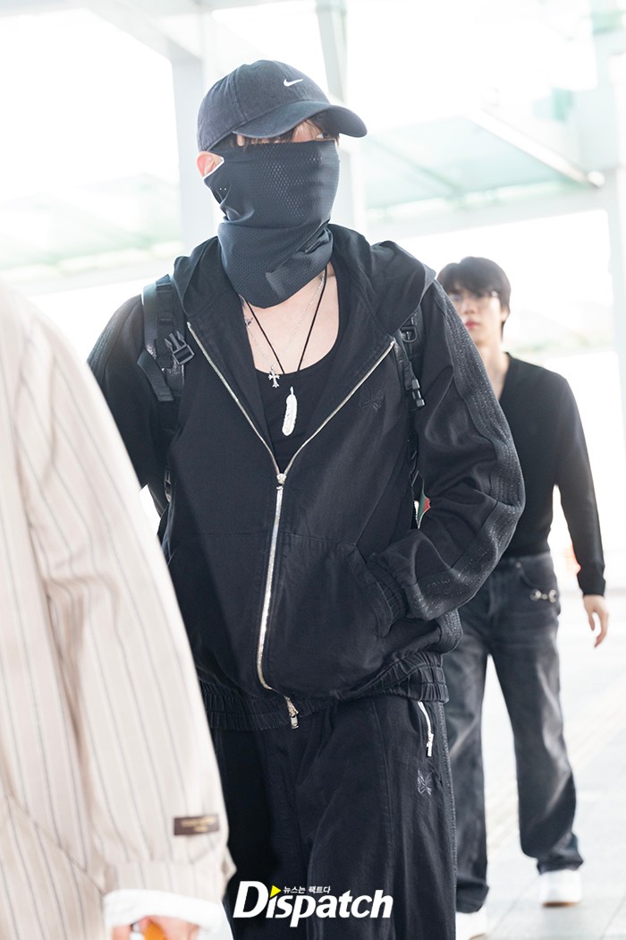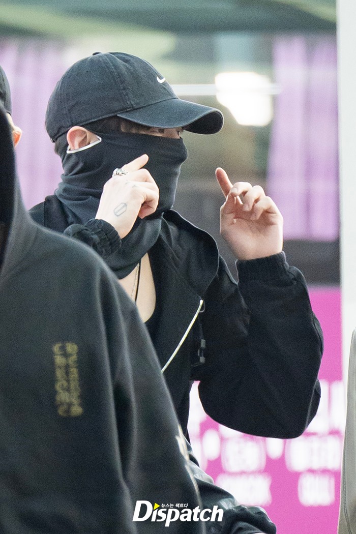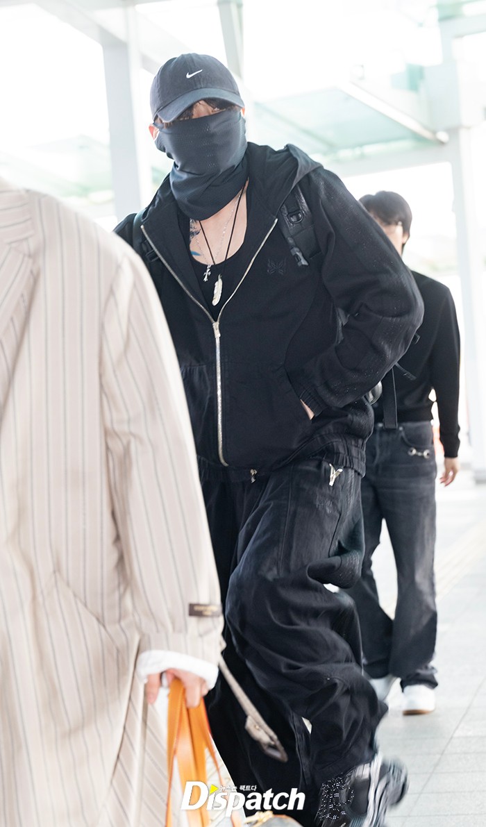 정국은 올블랙룩으로 시크한 공항패션을 완성했다. 멤버들과 함께 이야기를 나누며 즐겁게 출국길을 올랐다.