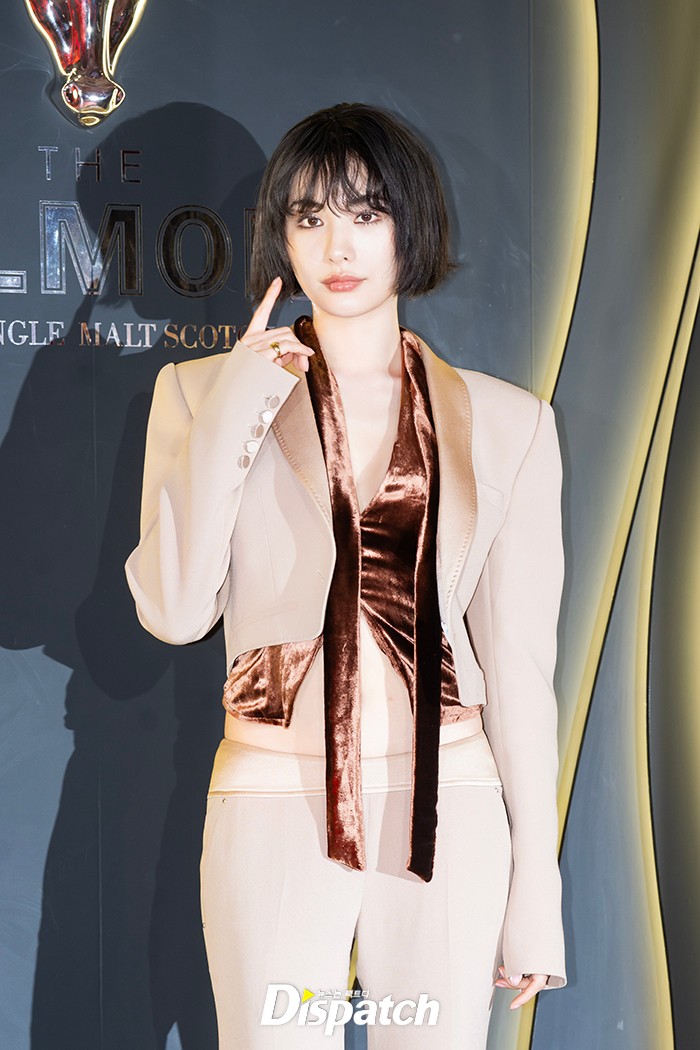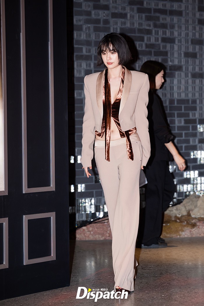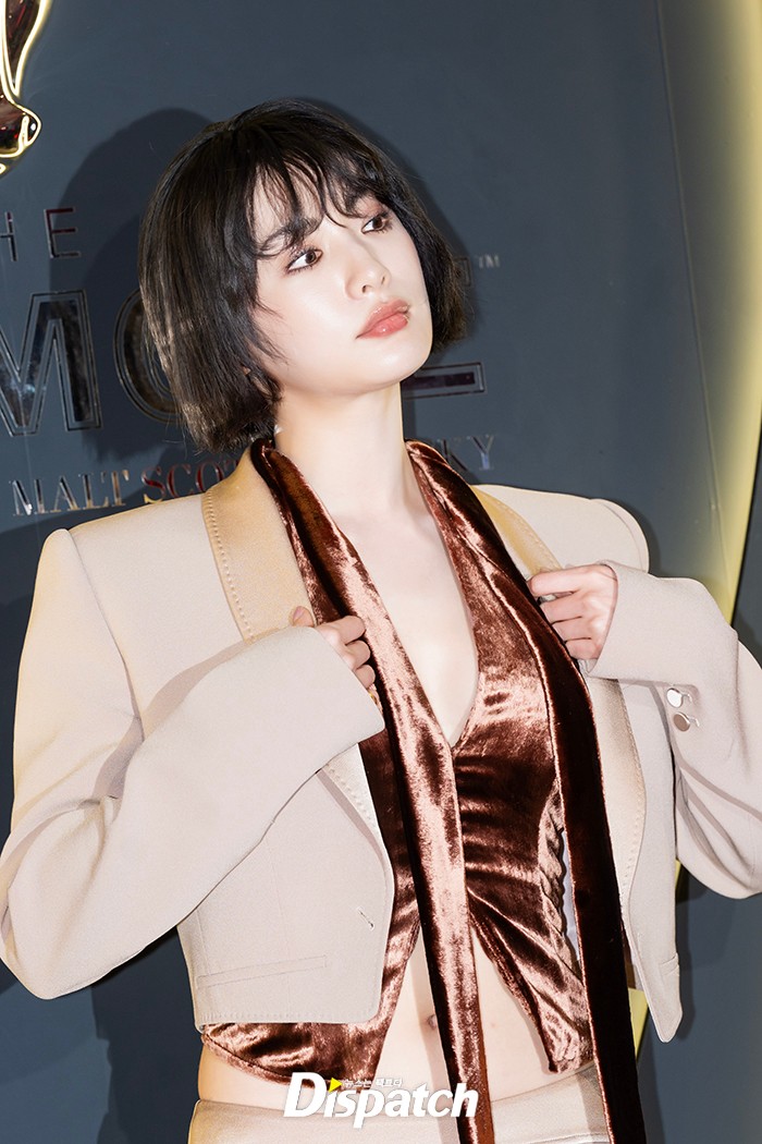 나나는 벨벳 홀터넥 베스트와 누드톤 수트로 매니시룩을 완성했다. 섹시미가 돋보였다.