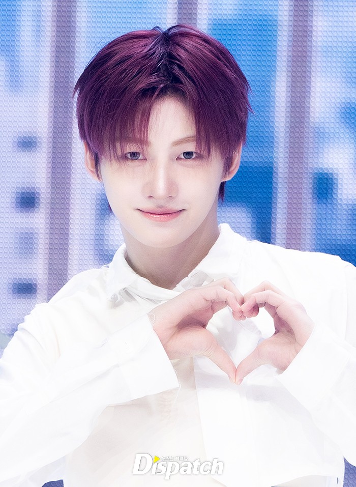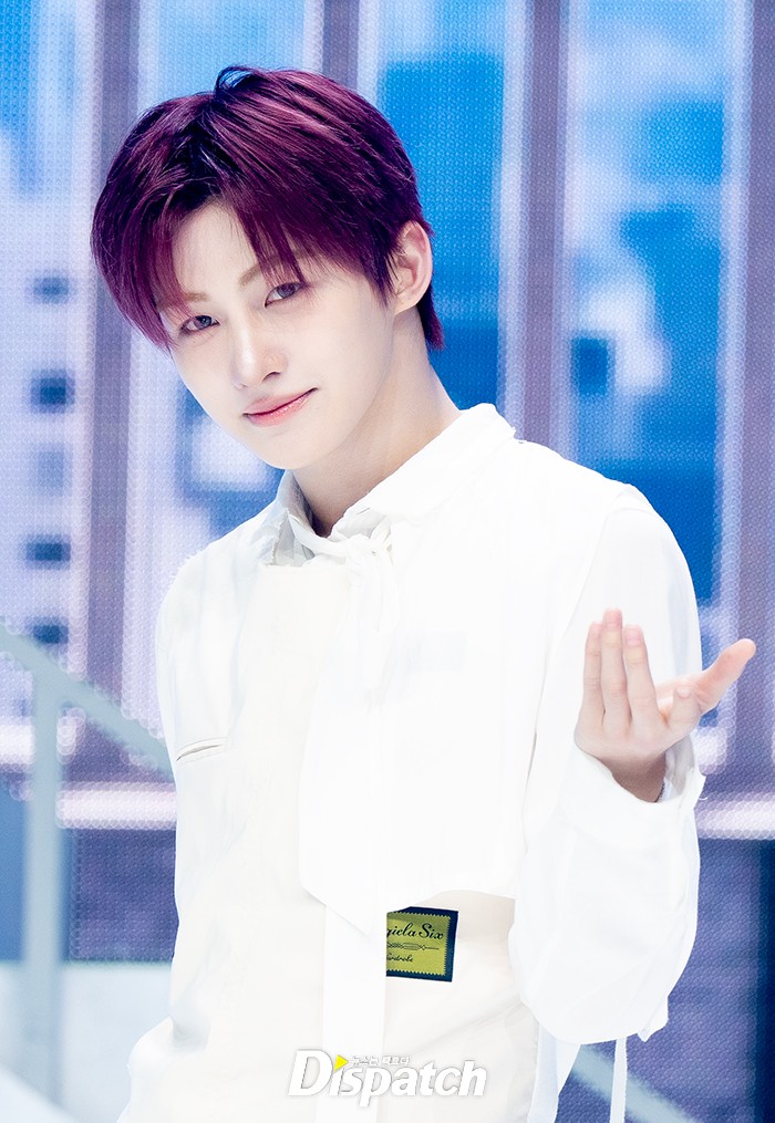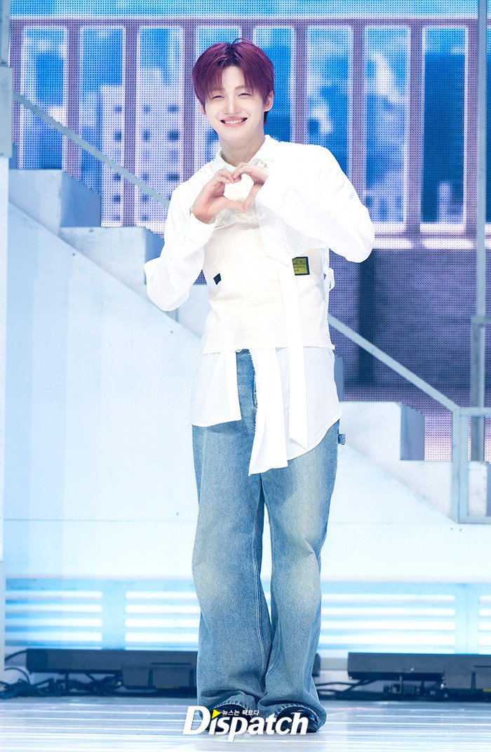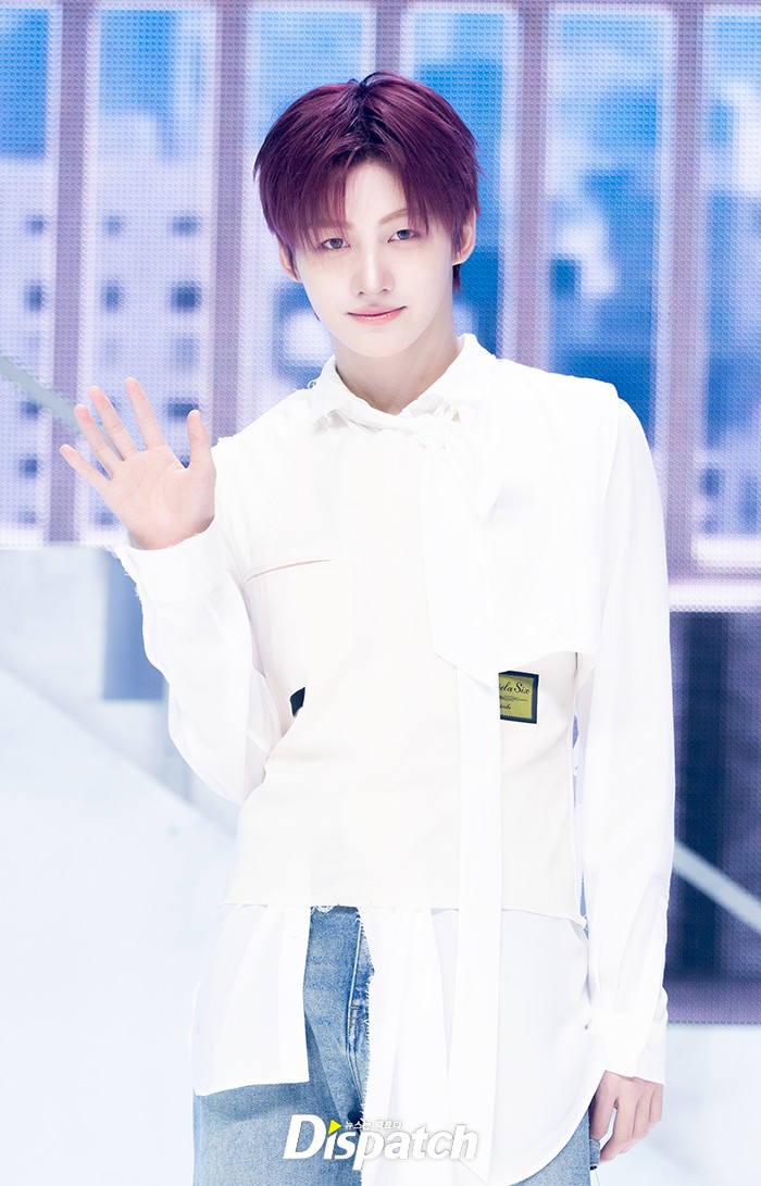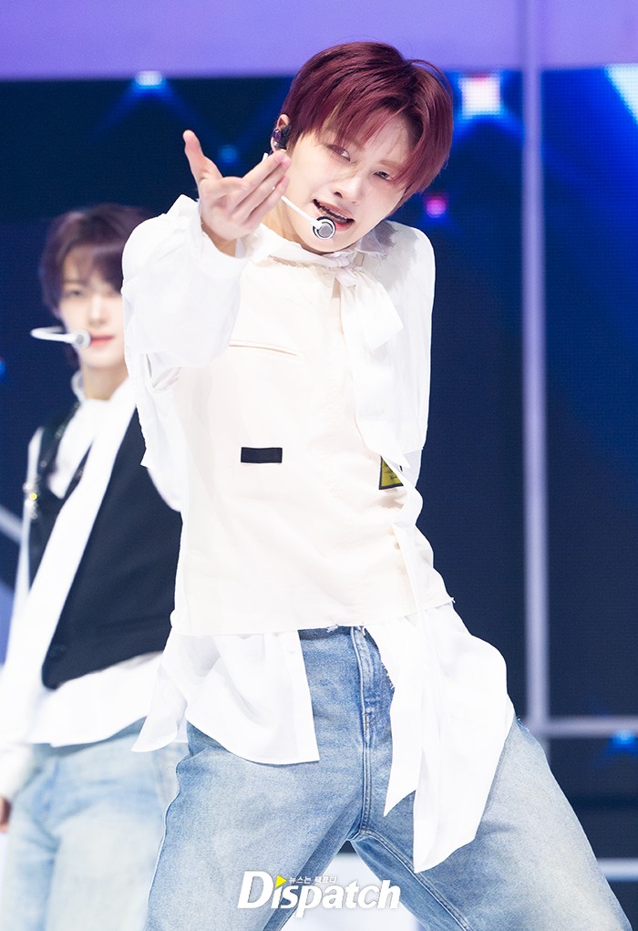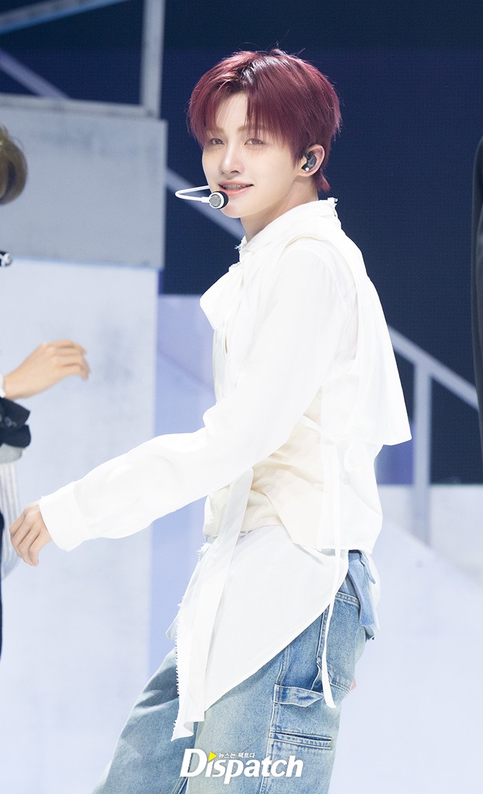 지훈은 화이트 셔츠와 청바지로 깔끔한 스타일을 보여줬다. 레드헤어로 강렬한 스타일을 완성했다.